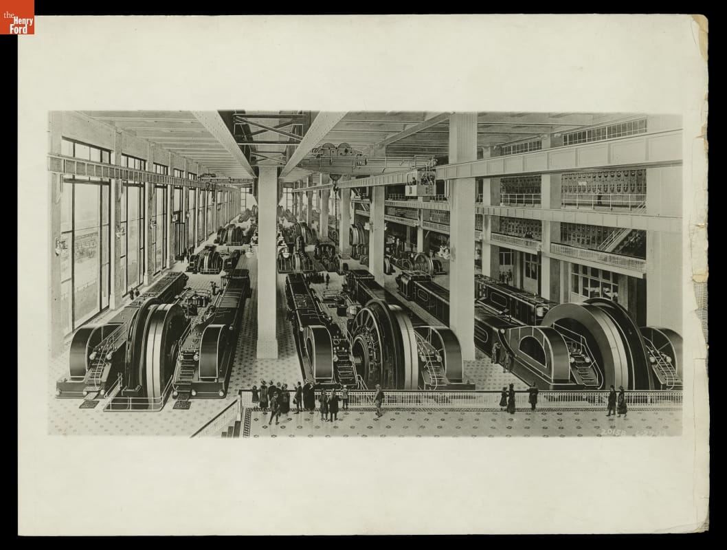 Ford Motor Company opened its Highland Park plant in 1910. It was here that Ford built most of its 15 million Model T cars, developed its moving assembly line, and instituted its Five Dollar Day. The plant's electricity was supplied by an on-site powerhouse with generators connected to nine gas-steam hybrid engines. Together, the nine engines produced 53,000 horsepower.
