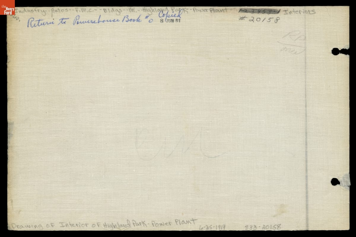 On front: 20158 6-27-17 On back: Drawing of Interior of Highland Park Power Plant | 6-25-1917 [sic]