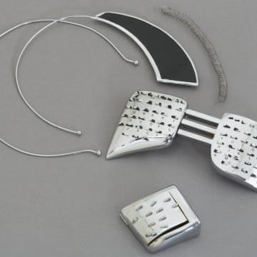 The Walking Office Wearable Computer is a prototype model created by the design group Salotto Dinamico. This proposed device subverted where (and when) the office could be, turning the human body into a mobile workstation. A keyboard, display arc, and cassette recorder became personal adornment--also capable of pairing with an acoustic modem to exchange data through telephone lines.