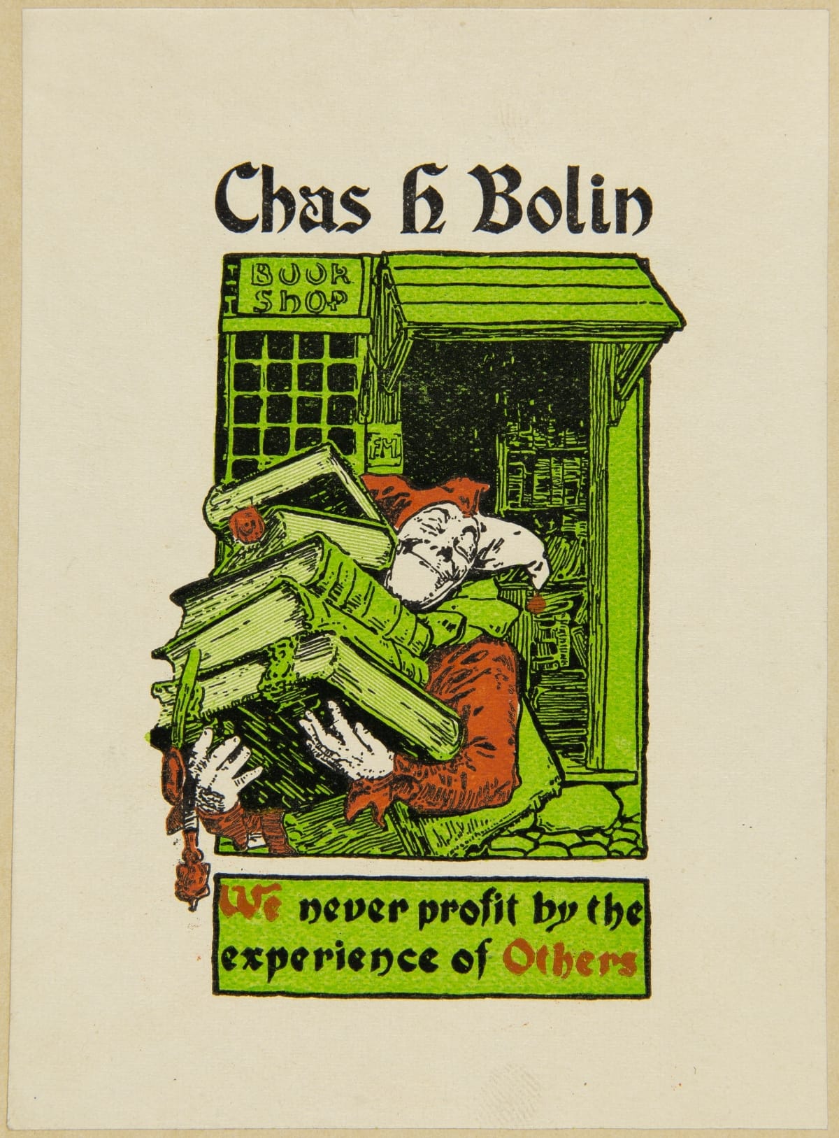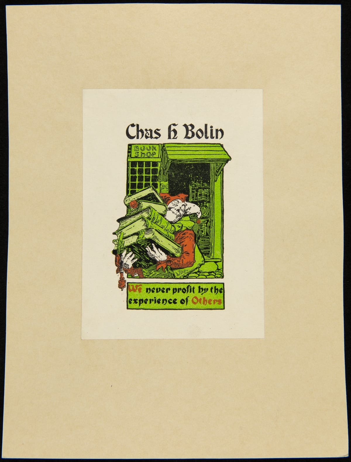Bookplates show ownership, but they can also tell us more. Often pasted on the inside of a book's front cover or endpaper, these printed labels contain the owner's name and sometimes the words "ex-libris" (Latin for "from the library of"). Coats of arms, crests, other decorative images, poems, mottoes, and even font type provide insight into the beliefs, passions, and interests of the book's owner.