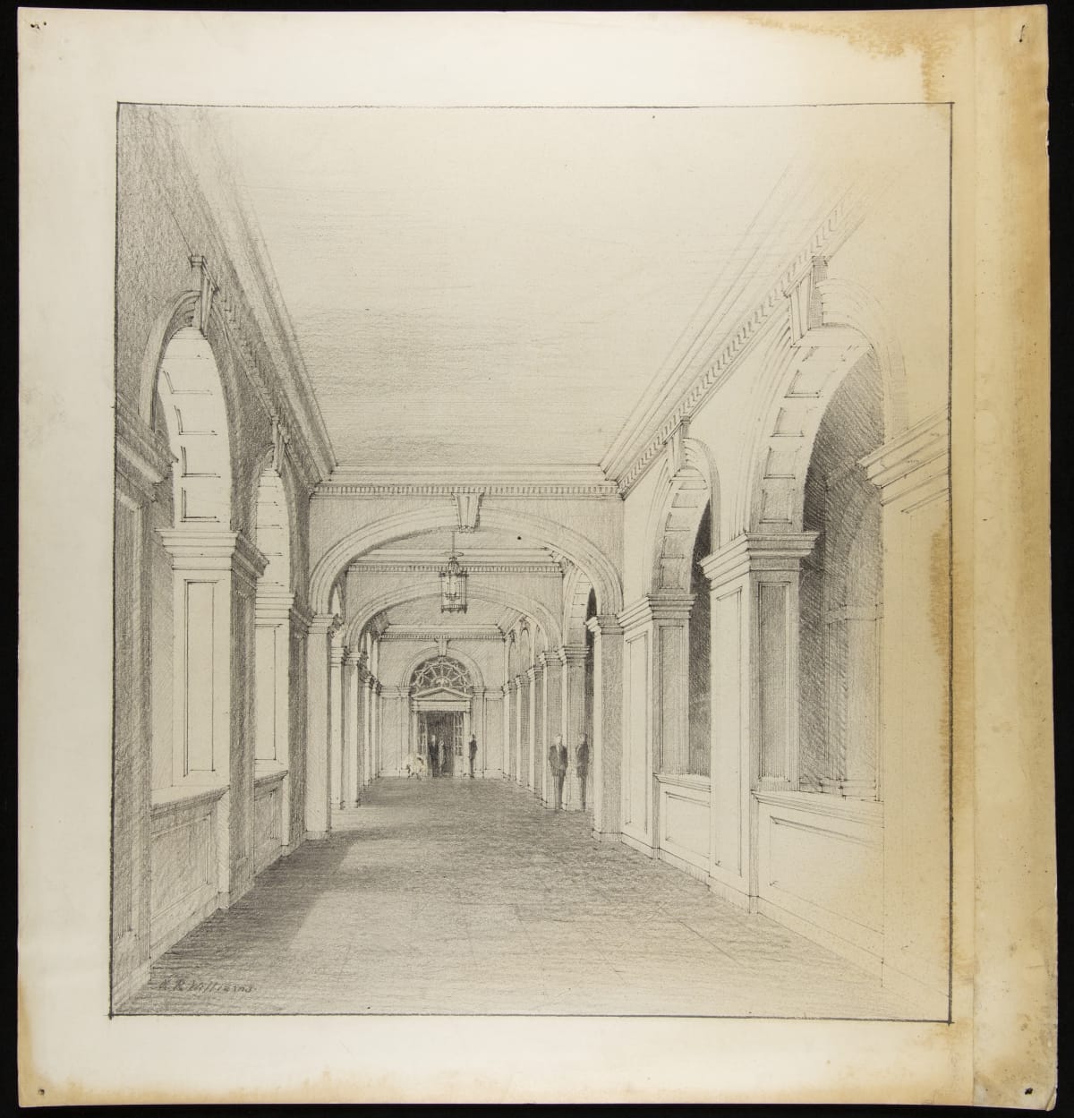 One of a series of views of the Museum as built, this black and white drawing shows a long corridor which runs along the front of the Museum. Known as the Promenade, this marble floored space also connects front of the Museum with the exhibit gallery behind. This view shows the main entrance into the Museum from the clock tower which is behind us.