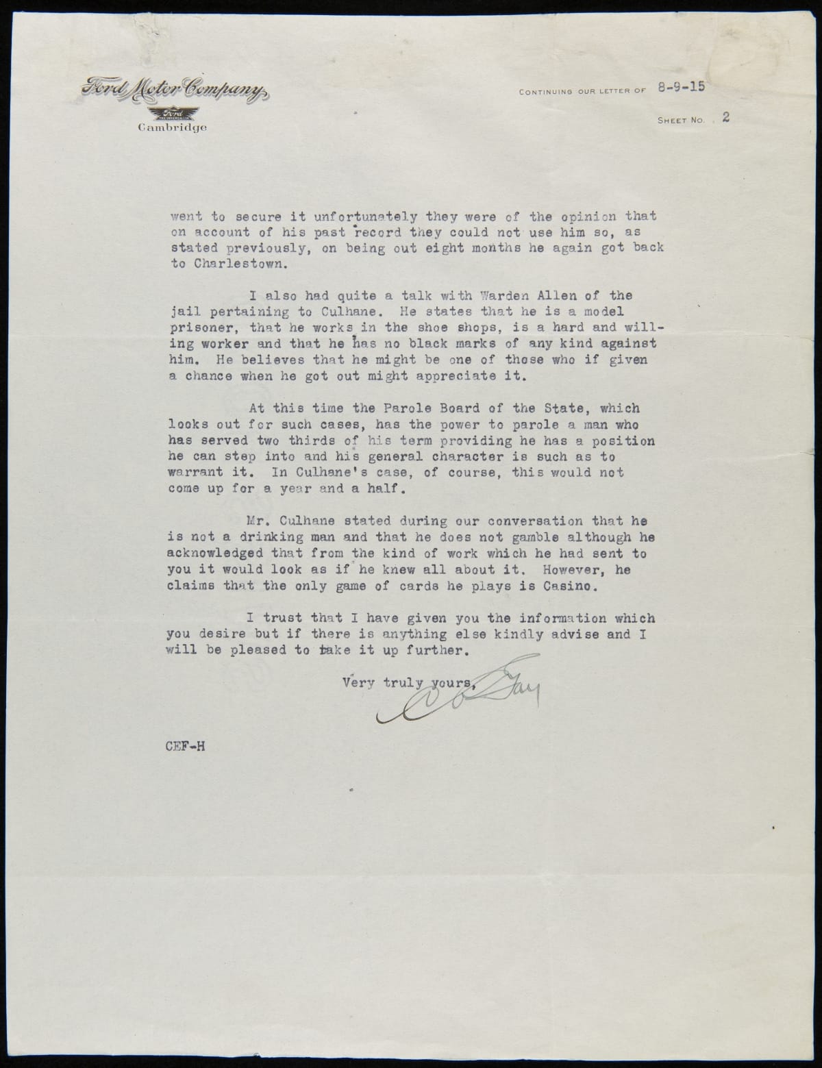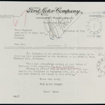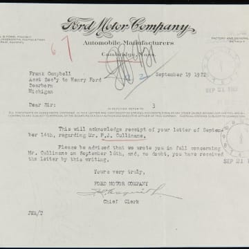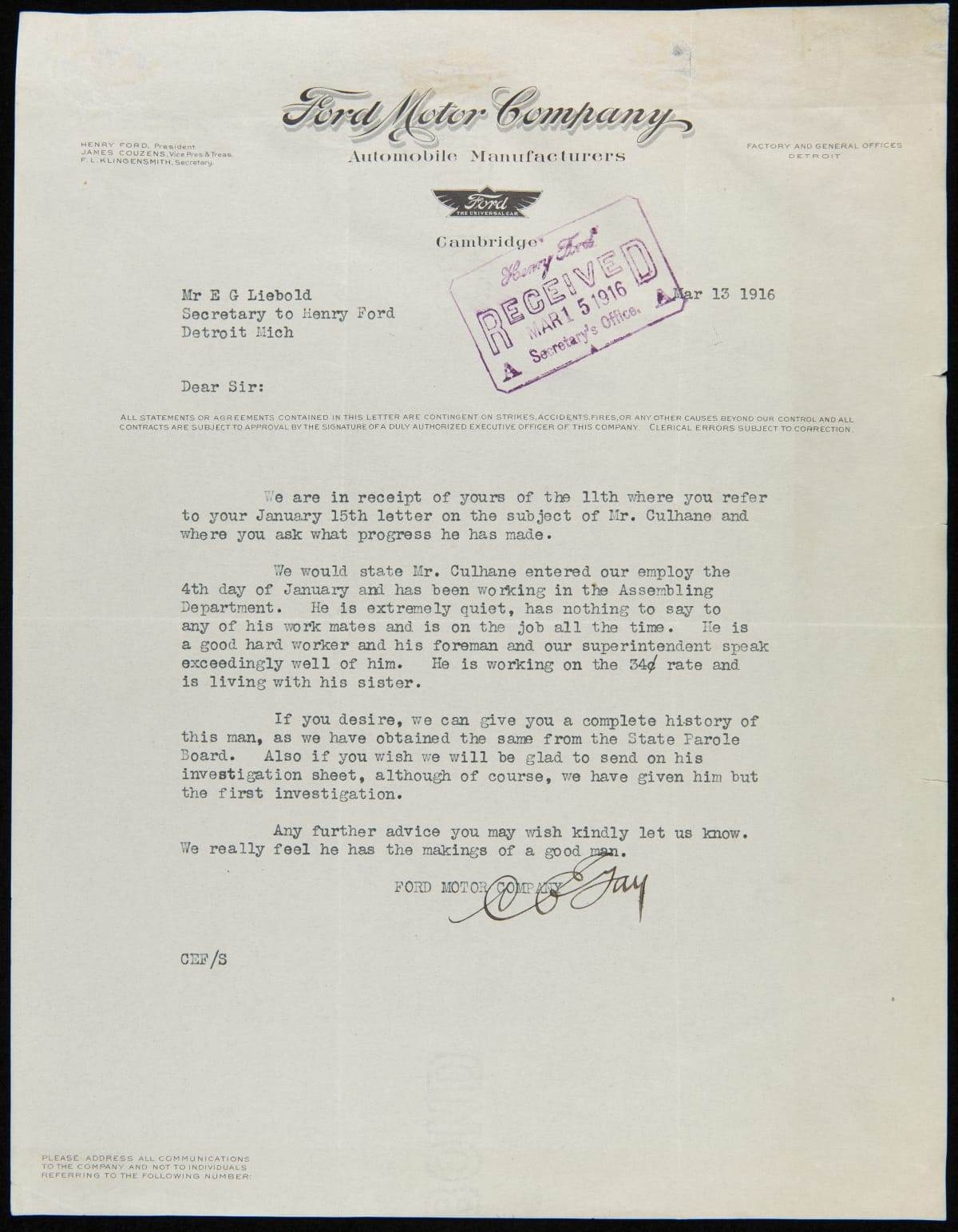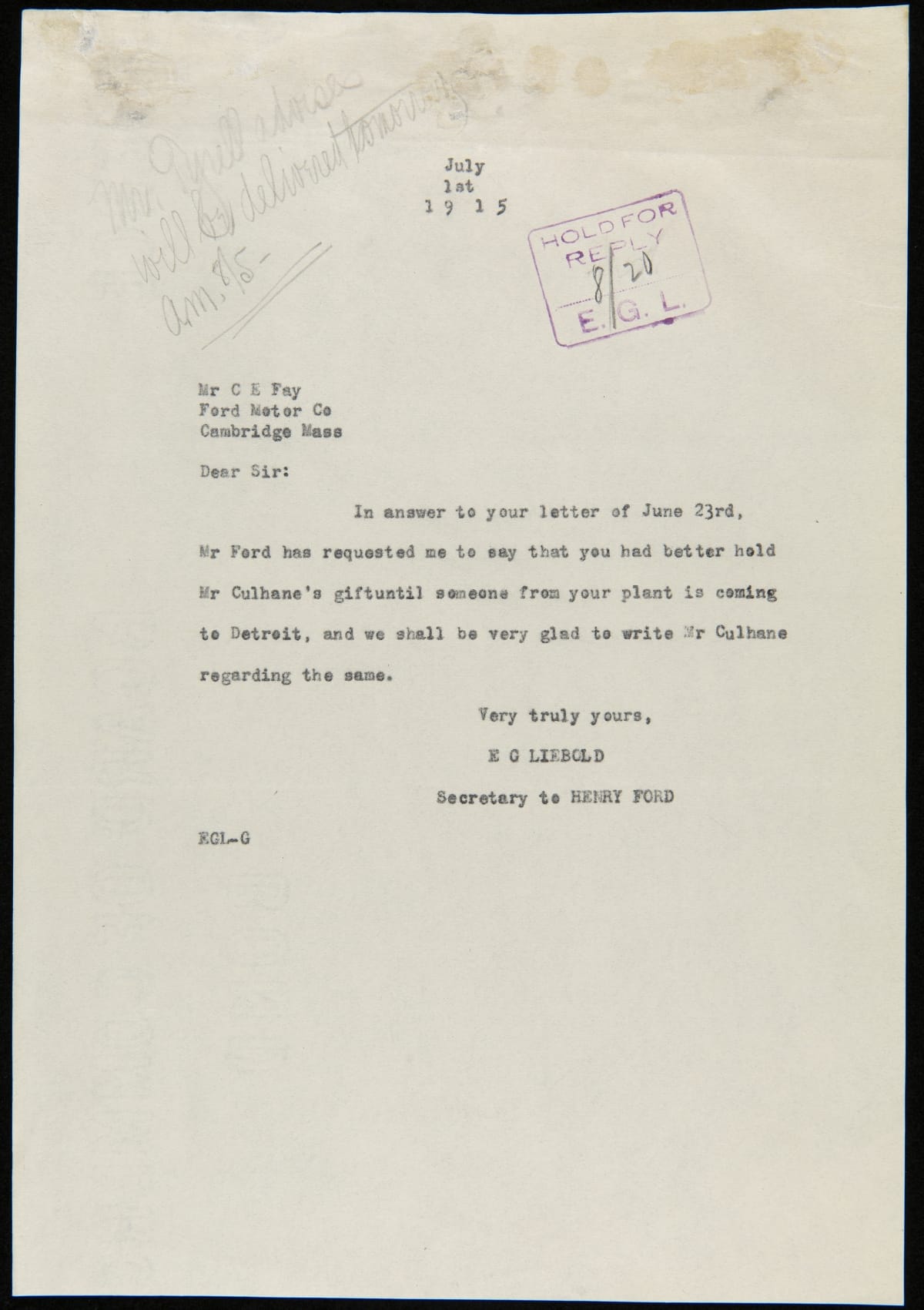 Correspondence regarding Patrick J. Culhane and the Diorama He Created and Gave to Henry Ford, June 1915-March 1922