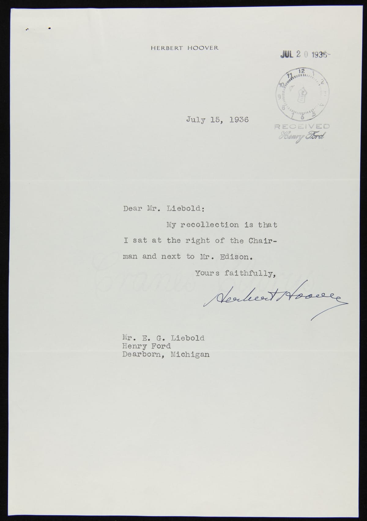 In the mid-1930s, more than six years after the Light's Golden Jubilee celebration, Henry Ford commissioned a panoramic painting of that evening's banquet. Letters were sent to attendees -- including the special guests at the head table -- asking them to indicate on an enclosed diagram where they sat during the event. Former President Herbert Hoover reported his position in this polite and succinct letter.