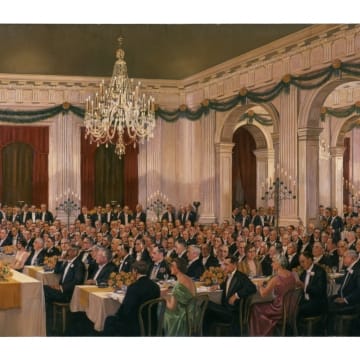 In the mid-1930s, more than six years after the Light's Golden Jubilee celebration, Henry Ford commissioned a panoramic painting of that evening's banquet. Letters were sent to attendees--including those at the head table--asking where they sat and for a photograph so that their image could be included in the painting. Former First Lady Lou Henry Hoover replied and gave her impressions of the evening.