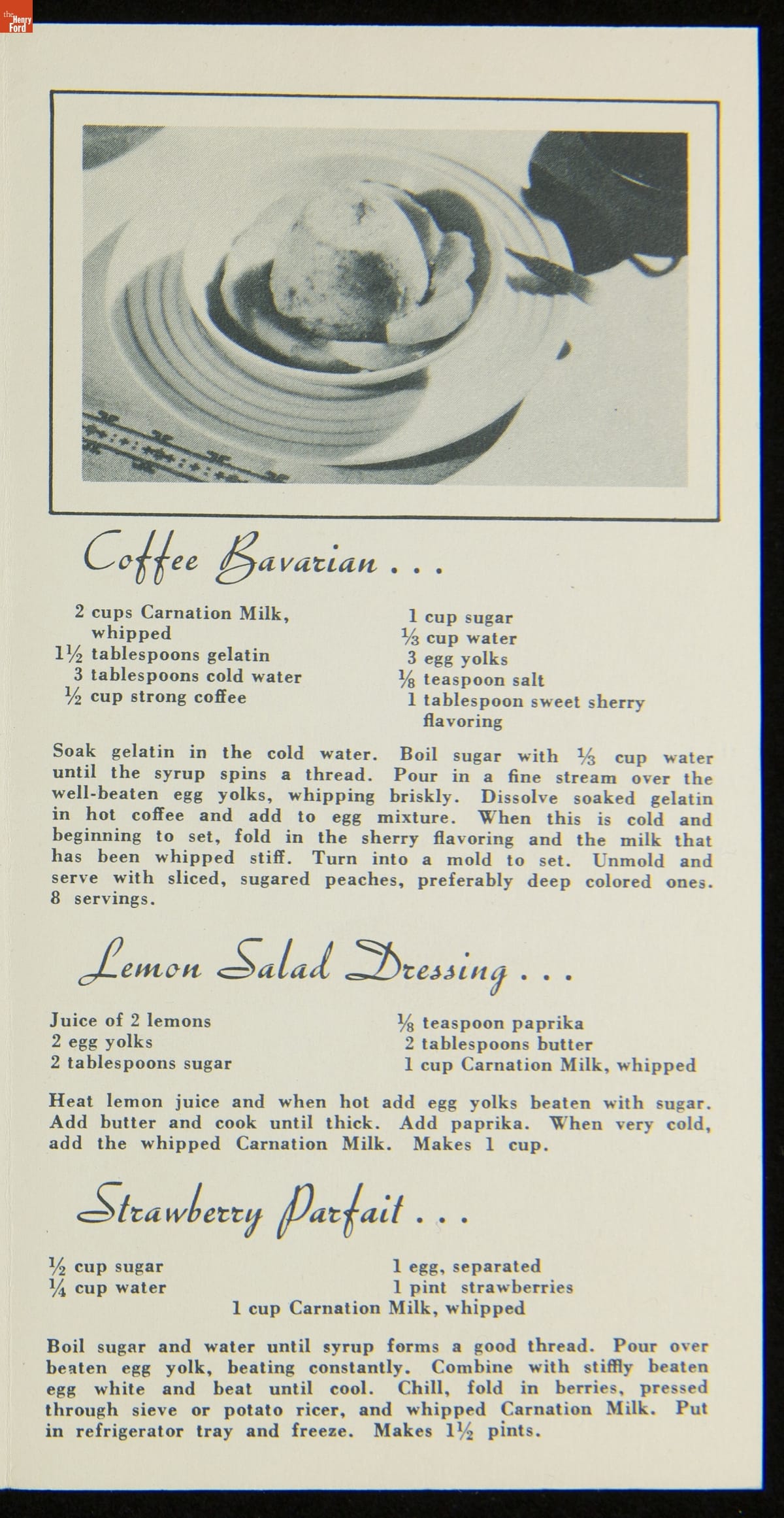 In 1899, Elbridge Amos Stuart developed his evaporated milk product -- his alternative to fresh milk, which was quick to sour. He prided himself on producing the highest quality of milk, under the name Carnation Evaporated Milk Company. Although similar to condensed milk, evaporated milk does not contain sugar, allowing for a broader range of uses. This booklet provides uses for Carnation milk in desserts.