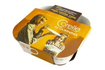on top of packaging: NEW / EVERYDAY DISHES BY CORNING / STRONG LIGHTWEIGHT / DISHWASHER SAFE / OVEN SAFE / FOUR SAUCERS / 506 4 BUTTERFLY GOLD / LOOKS, FEELS AND RINGS LIKE CHINA / Corelle / LIVINGWARE / by CORNING on front, sides and back of packaging: 506 4 BUTTERFLY CUPS on bottom of packaging: Corelle / LIVINGWARE / by CORNING / AMAZING NEW MATERIAL INVENTED / BY CORNING SCIENTISTS / looks, feels and rings like china / resists breaking, chipping, scratching and crazing / completely safe in the dishwasher and oven / lightweight / CORNING / CORNING GLASS WORKS / CORNING NEW YORK / 506 4 BUTTERFLY GOLD / CORELLE LIVINGWARE / REPLACEMENT PROMISE: / Corning promises to replace without charge any piece of Corelle(R) Livingware that should break, craze, chip or stain during 2 years of normal household use.