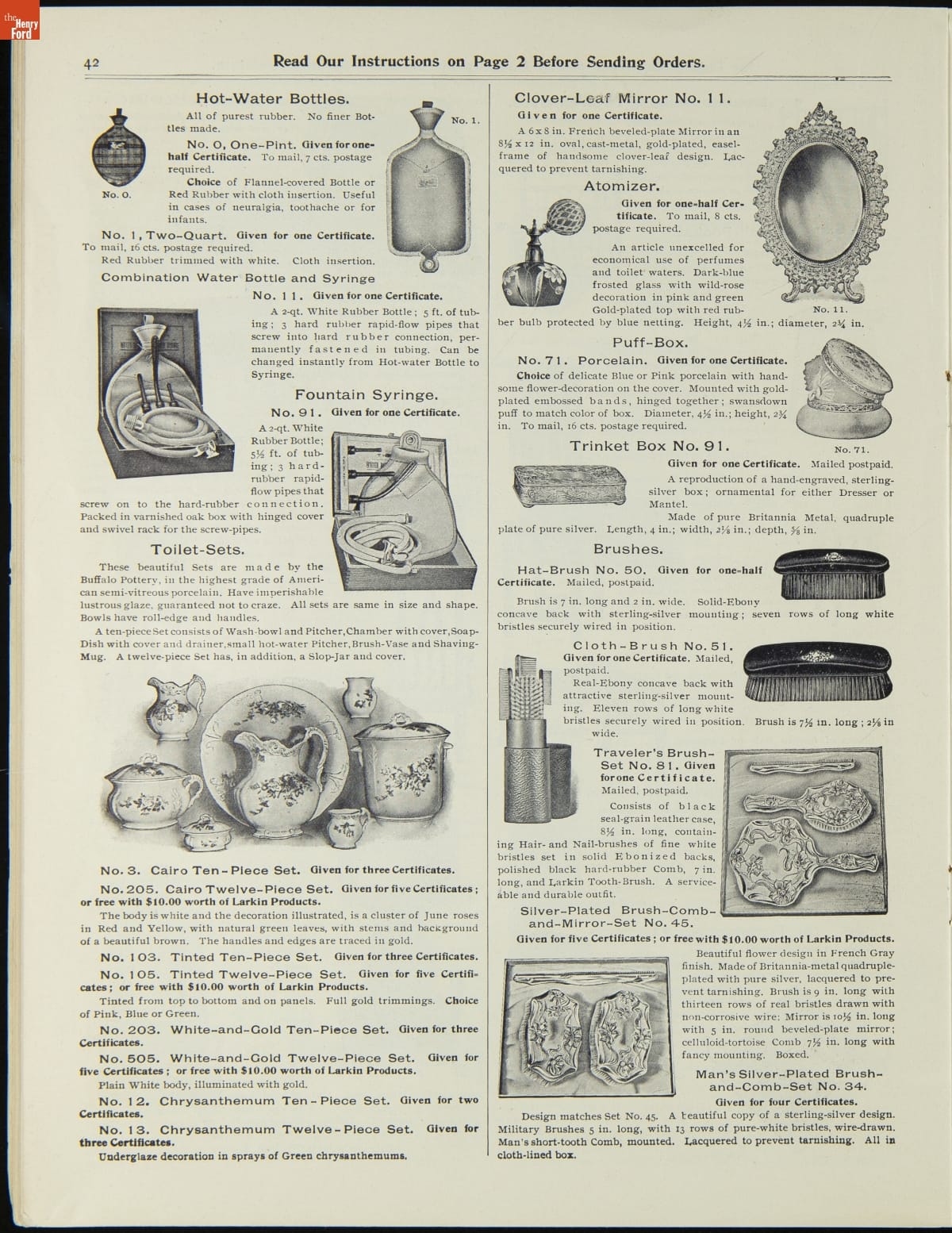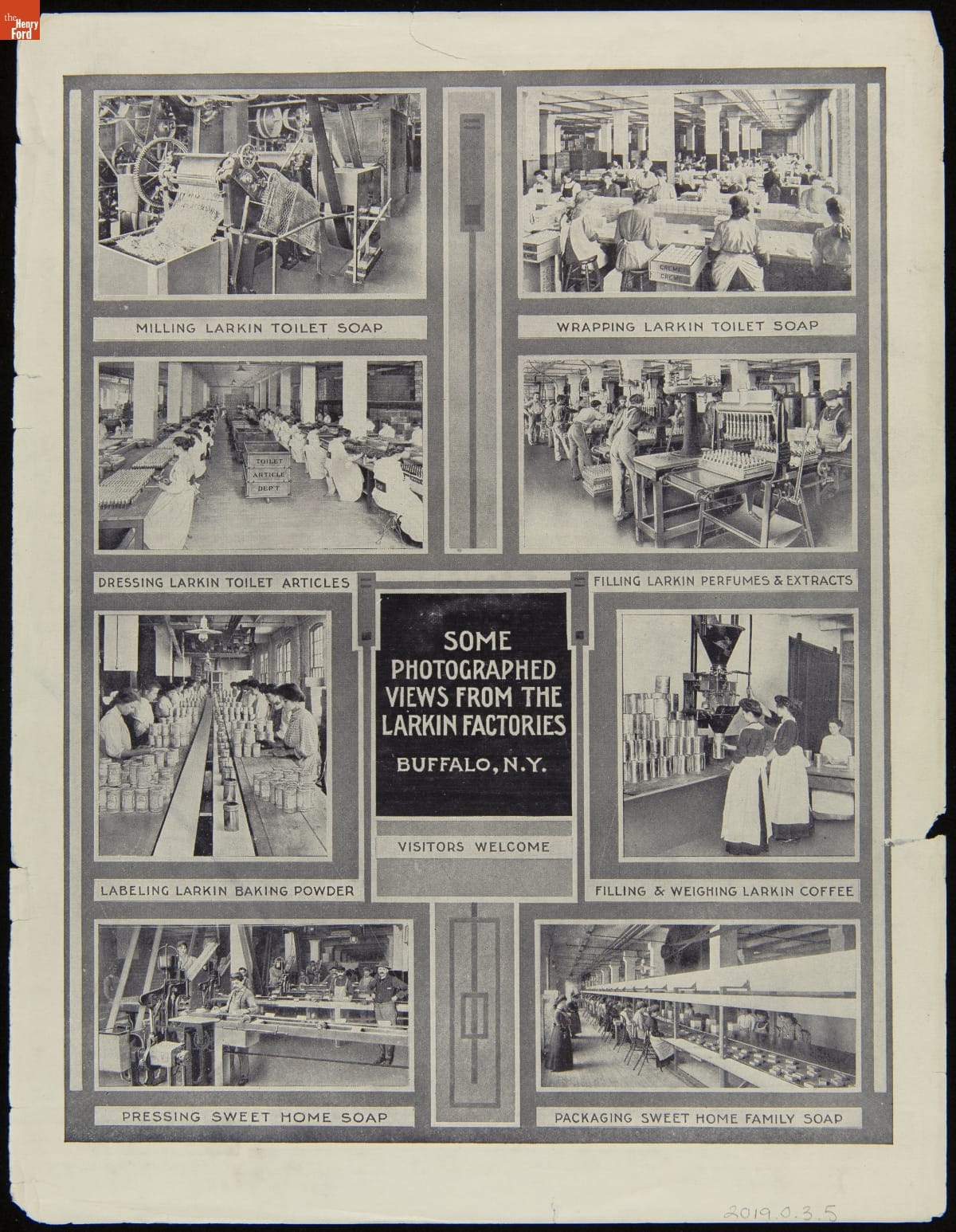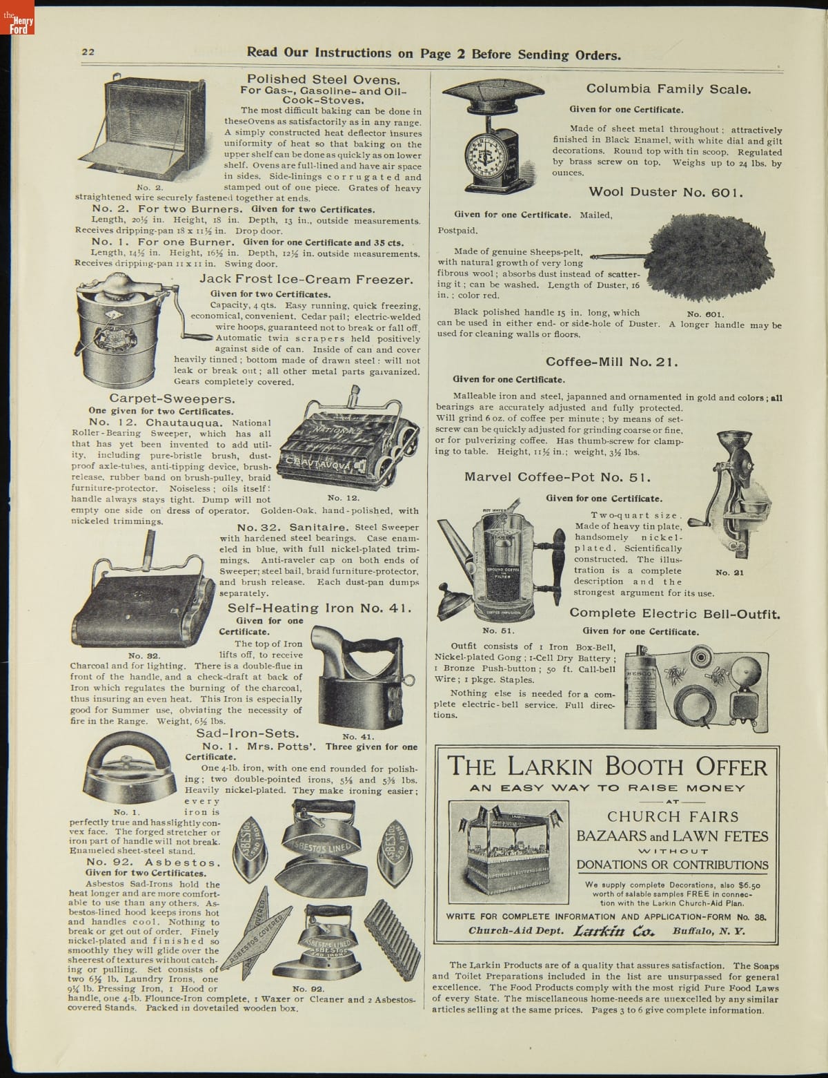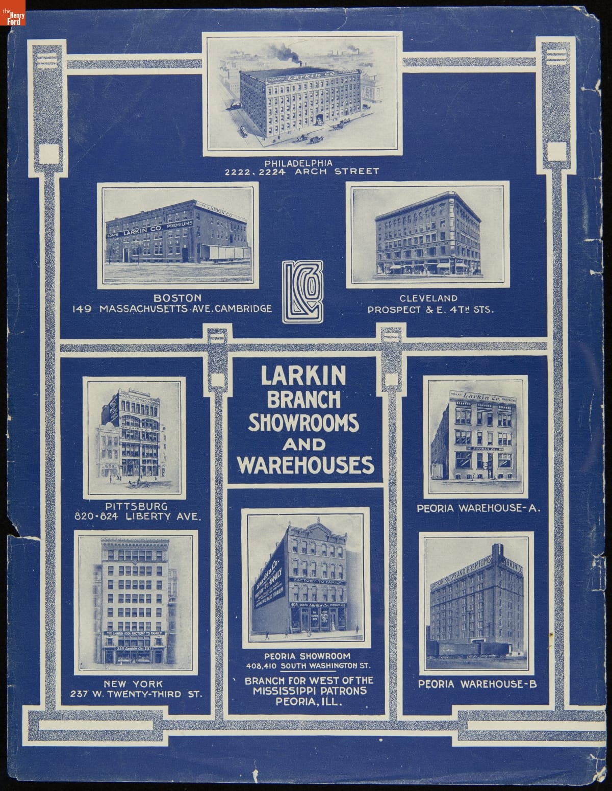 John D. Larkin established a soap manufacturing company in 1875. He hired his brother-in-law, Elbert Hubbard, as a salesman. Hubbard developed "The Larkin Idea," a plan that sold goods directly to consumers through mail-order catalogs and offered incentivizing giveaways. It was a success. By the early 1900s, Larkin's catalogs contained pages of products and even more pages of premiums from which customers could choose.