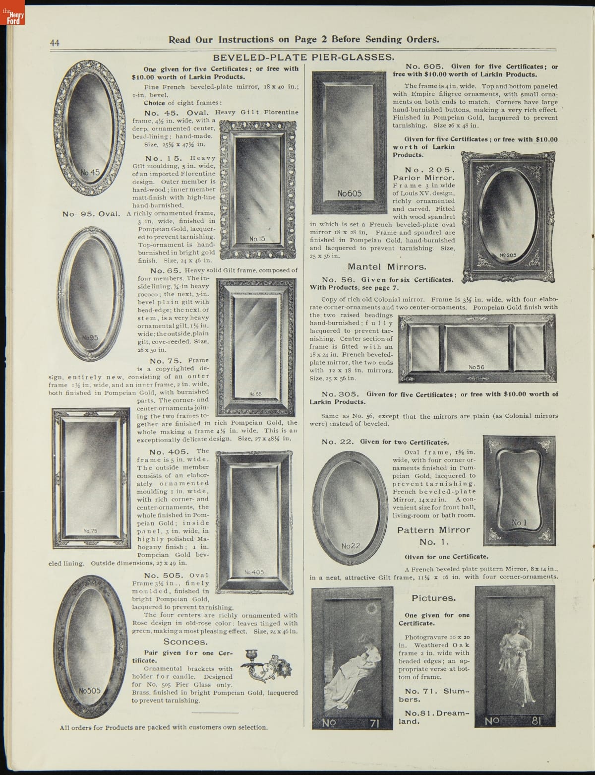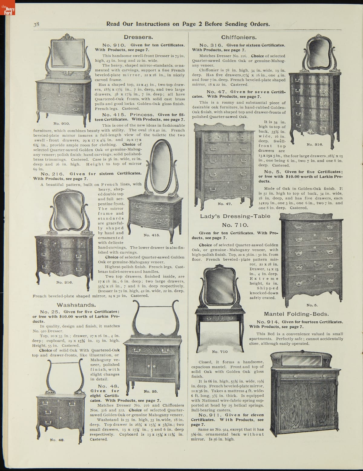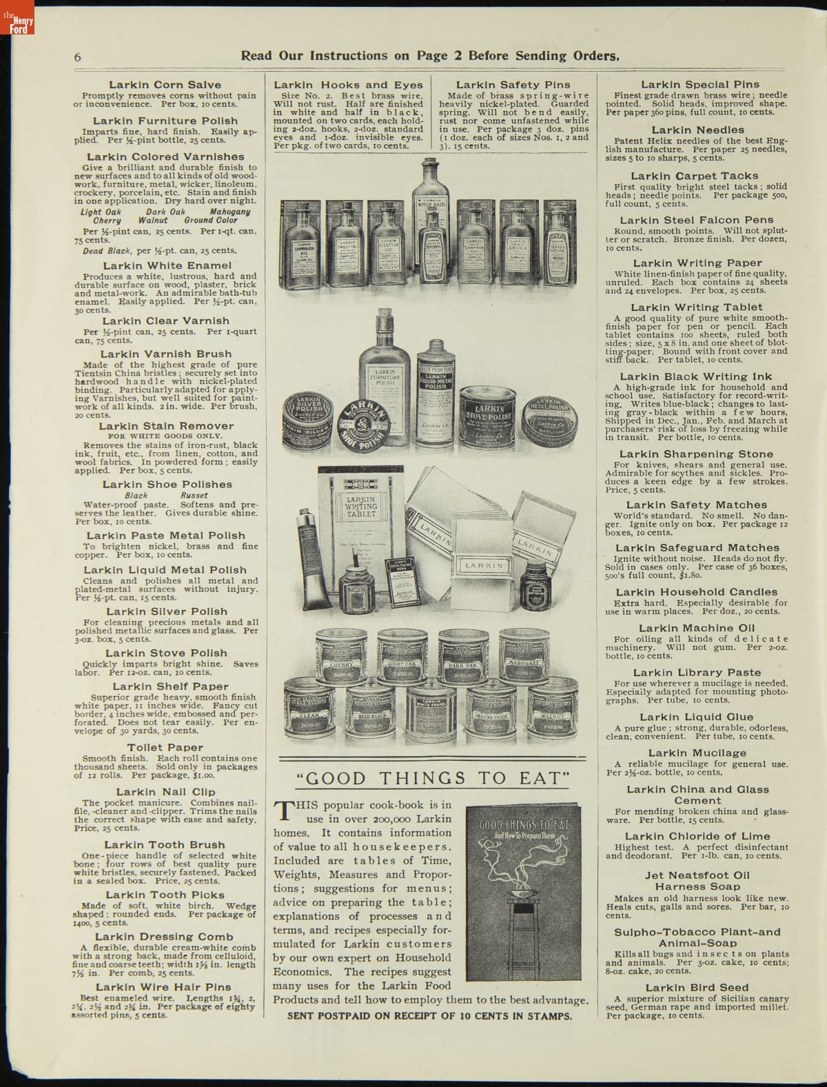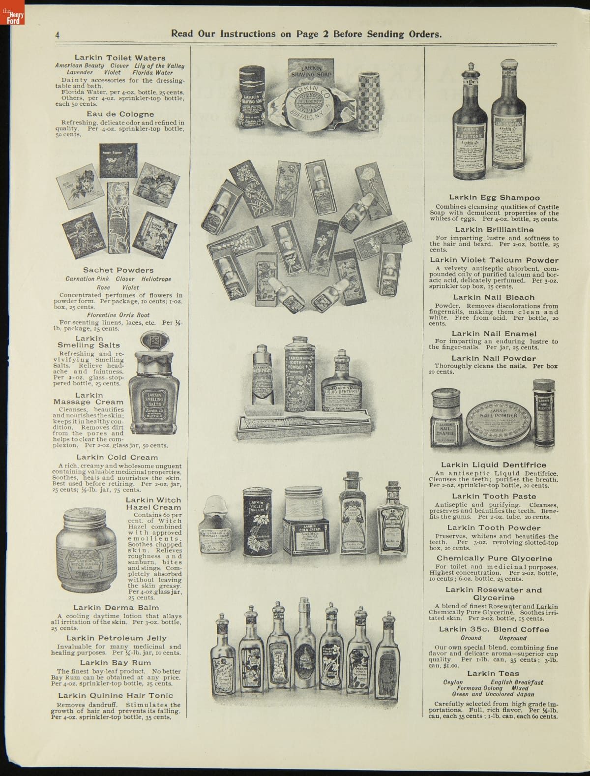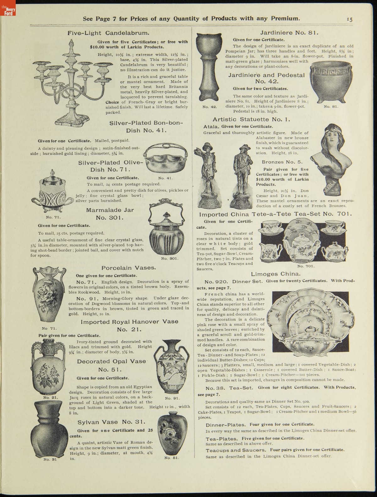 John D. Larkin established a soap manufacturing company in 1875. He hired his brother-in-law, Elbert Hubbard, as a salesman. Hubbard developed "The Larkin Idea," a plan that sold goods directly to consumers through mail-order catalogs and offered incentivizing giveaways. It was a success. By the early 1900s, Larkin's catalogs contained pages of products and even more pages of premiums from which customers could choose.