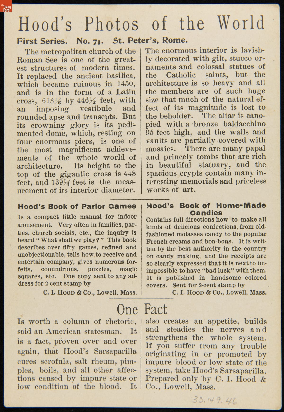 Trade Card for C.I. Hood & Co. with Hood's Photos of the World, "St. Peter's, Rome," 1890-1910