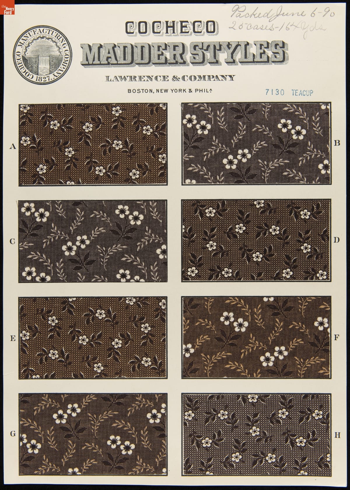 Sample Card for Textile Fabric Style No. 7130, "Teacup," Cocheco Mfg. Co., June 6, 1890