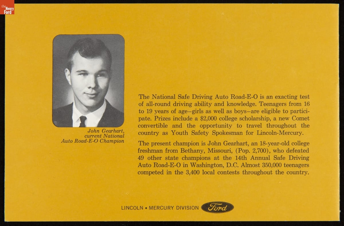 Ford Motor Company's Lincoln-Mercury Division published How to Earn the Keys to Dad's Car in 1966. It included advice to both teenagers and parents for safe and responsible driving. The booklet featured Colette Daiute, Miss Teenage America 1966 and youth safety spokesperson for Lincoln-Mercury. Automakers distributed guidebooks to high schools -- hoping that student drivers would someday become loyal customers.