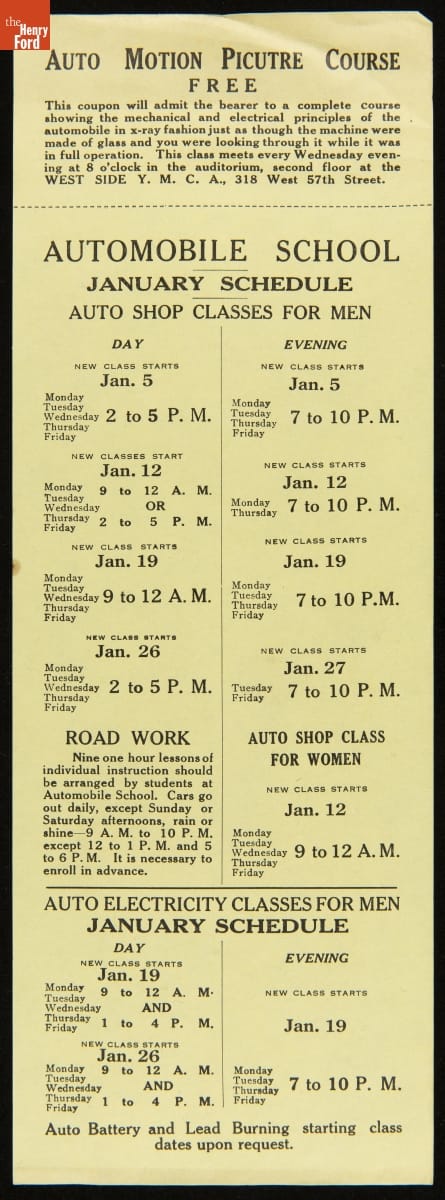 Driver education did not become a regular part of American high schools until the 1930s. Prior to that, young drivers -- or older first-time drivers -- could take instructional courses offered by automobile dealers or community organizations. This brochure advertised a course offered by a YMCA in New York City. Early courses often taught auto care and maintenance as well as driving.