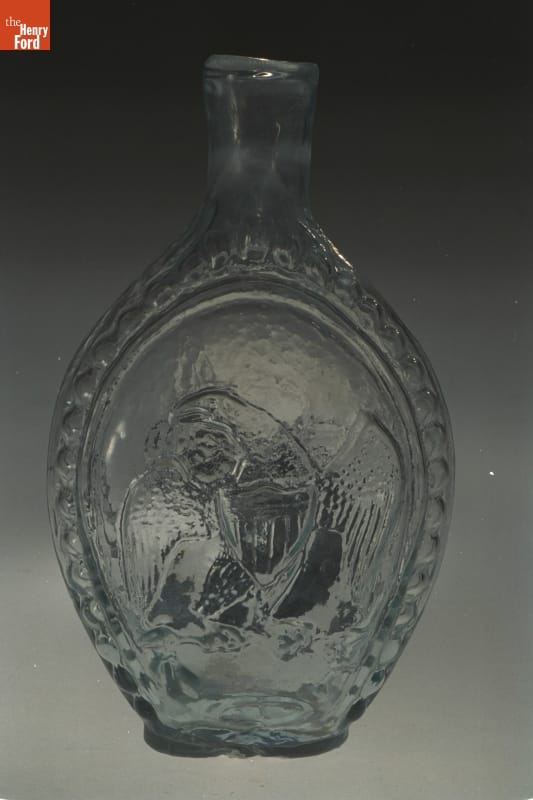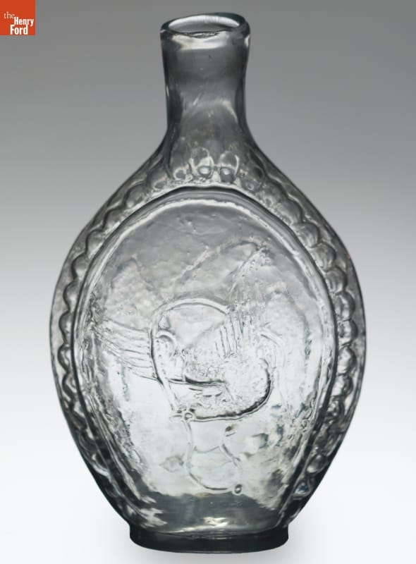 Glass factories in America began producing inexpensive, mold-formed flasks in the early 1800s. These figured flasks, often decorated with symbols of national pride or political or cultural affiliation, appealed to America's common man. Many flasks, like this one, contain images of an eagle -- a traditional symbol for America.