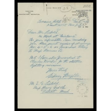 Sidney Houghton, a London-based interior designer, met Henry Ford during World War I. Houghton worked on Ford's "Eagle Boats," supplied to the U.S. and British Navies. Following the War, Henry and Clara Ford commissioned Houghton to create a variety of interiors for their home and other projects. Houghton submitted this drawing detailing the interiors of Fair Lane, the Ford Estate in Dearborn, Michigan.