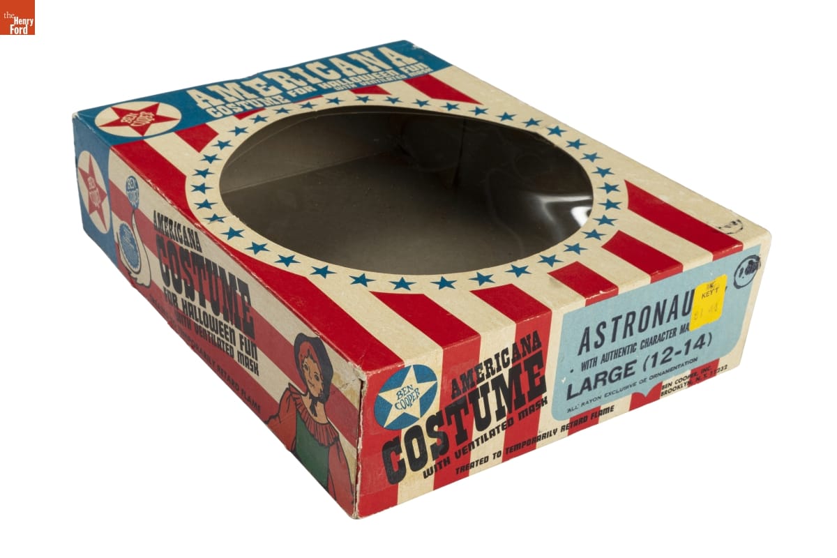 on mask: NASA /ASTRONAUT on front of jumpsuit: NASA on tag at collar of jumpsuit: BEN COOPER / TREATED TO / TEMPORARILY / RETARD FLAME / NOT WASHABLE / WASHING / REMOVES FLAME / RETARDANT / MADE IN U.S.A. / Large (12-14) on front of packaging: BEN / COOPER / AMERICANA / COSTUME FOR HALLOWEEN FUN / WITH VENTILATED MASK on ends of packaging: AMERICANA / COSTUME / WITH VENTILATED MASK / ASTRONAUT 887 / WITH AUTHENTIC CHARACTER MASK / LARGE (12-14) / ALL RAYON EXCLUSIVE OF ORNAMENTATION / 1.88 / TREATED TO TEMPORARILY RETARD FIRE / BEN COOPER, INC./ BROOKLYN, N.Y. 11232 on sticker on end of packaging: SSK / KEY 1 / $1.44 on sides of packaging: AMERICANA COSTUME / FOR HALLOWEEN FUN / WITH VENTILATED MASK / TREATED TO TEMPORARILY RETARD FLAME / BEN / COOPER / BEN / COOPER / SAFETY SEAL COSTUME / FLAME RETARDANT FABRICS / FLAMEPROOF VINYL MASKS / DOUBLE VENTED MASKS / EXTRA LARGE EYE HOLES / COLOR BRITE FOR / DAY & NIGHT on back of packaging: BEN / COOPER / SAFETY SEAL COSTUME / FLAME RETARDANT FABRICS / FLAMEPROOF VINYL MASKS / DOUBLE VENTED MASKS / EXTRA LARGE EYE HOLES / COLOR BRITE FOR / DAY & NIGHT