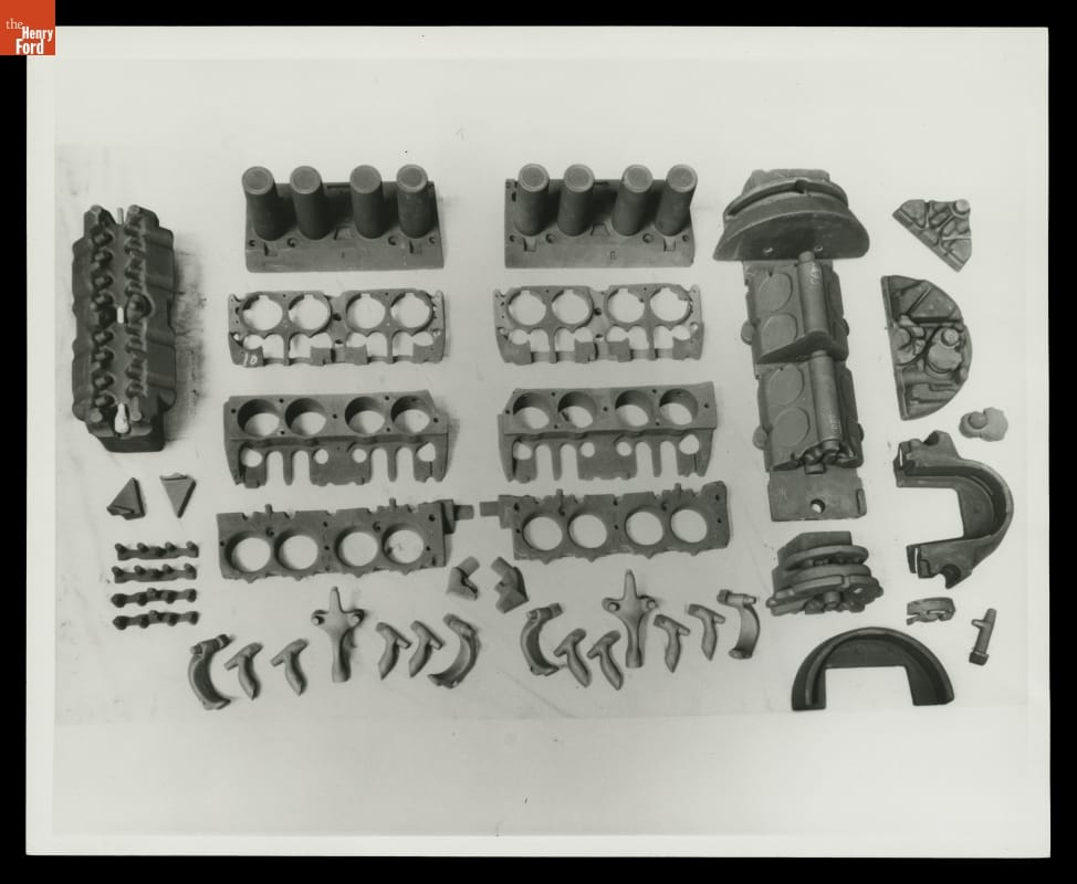 These molded sand shapes -- called cores -- were essential to casting the cylinder blocks for Ford V-8 engines. Automobile engines are mostly hollow inside. The cores were necessary to create voids in the final casting for the crank, pistons, valve gear, cooling water, and lubricating oil.