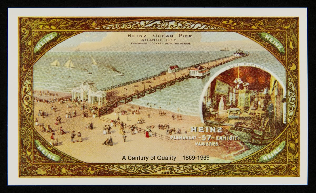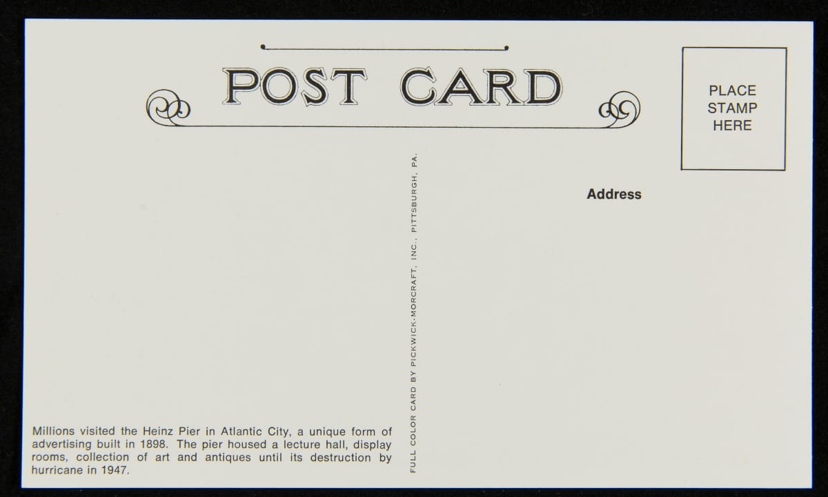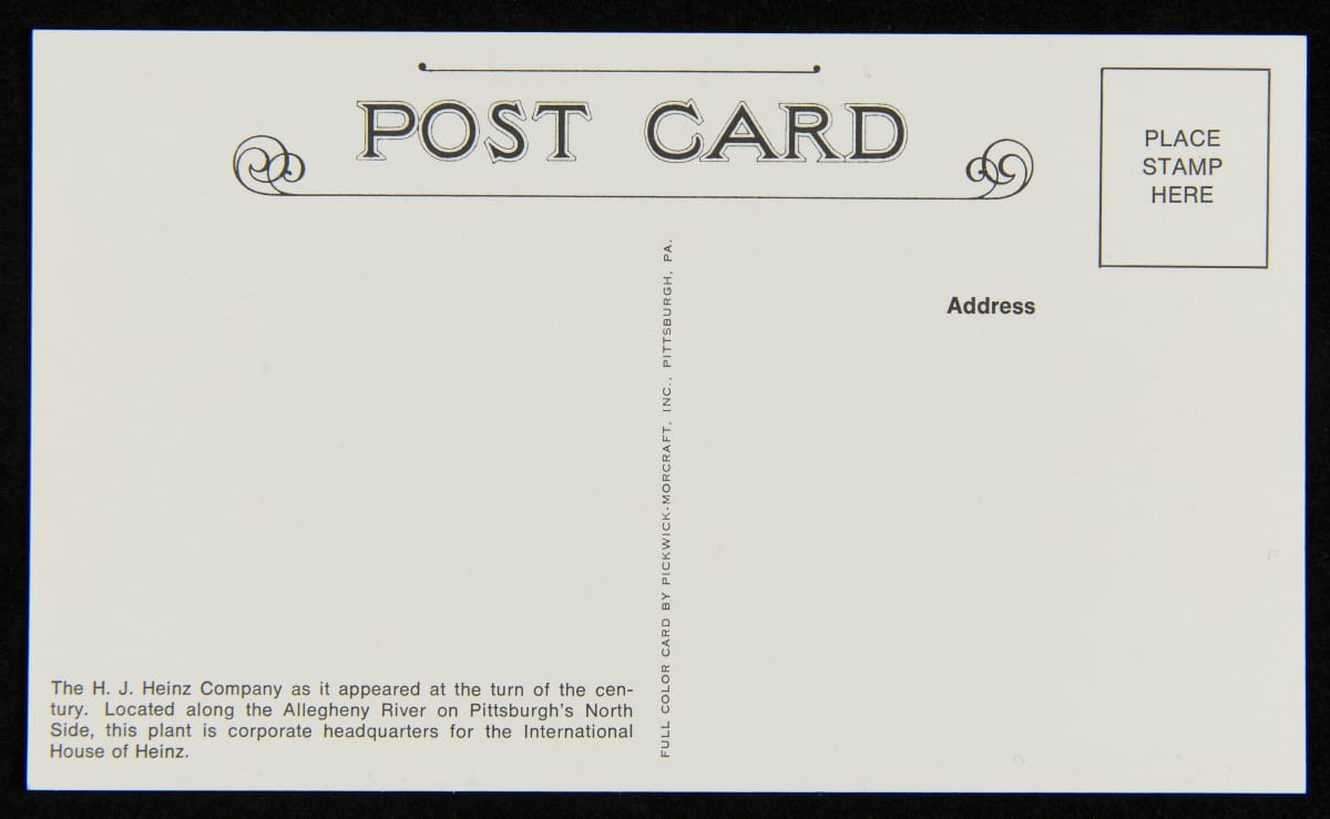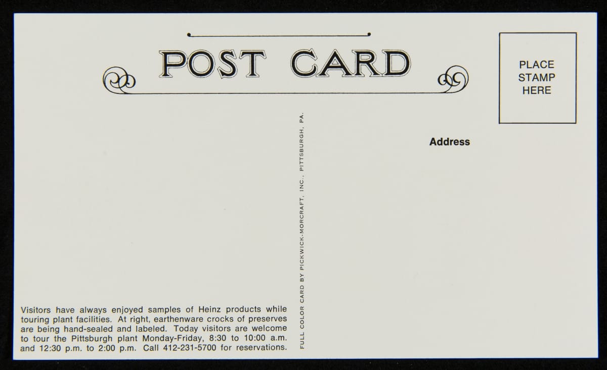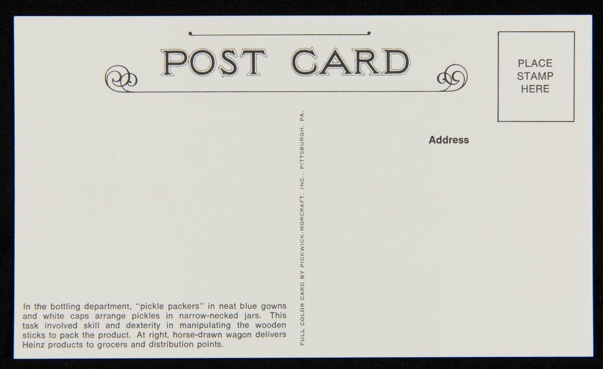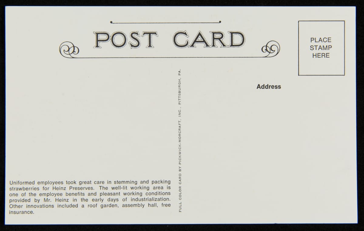 To commemorate its 100th anniversary, the H.J. Heinz Company produced this set of post cards. The colorful cards feature various scenes, including the Heinz main factory in Pittsburgh, Pennsylvania; the Heinz Ocean Pier in Atlantic City, New Jersey; Heinz employees crushing strawberries for preserves on Strawberry Day; the Visitors Sampling Room and the Preserving Department; and employees bottling pickles.