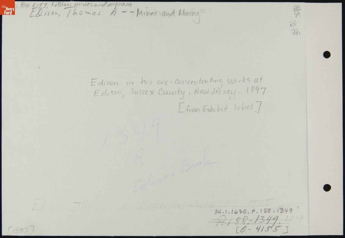 on front: THOMAS A EDISON / Copyright 1905 By / IRVING UNDERHILL, New York / B 7065 Handprinted in pencil on back side: Edison in his ore-concentrating works at / Edison, Sussex County, New Jersey. 1897 / {from Exhibit label} Handwritten under linen: 1349 / R / Edison book