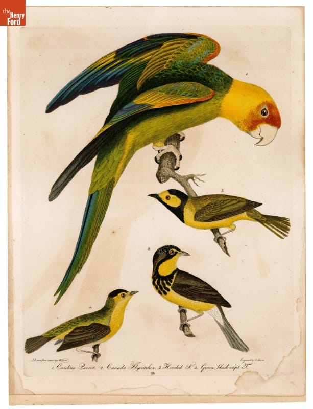 Engraving, Carolina Parrot, Canada Flycatcher, Hooded Flycatcher, and Green Black Capped Flycatcher, 1808