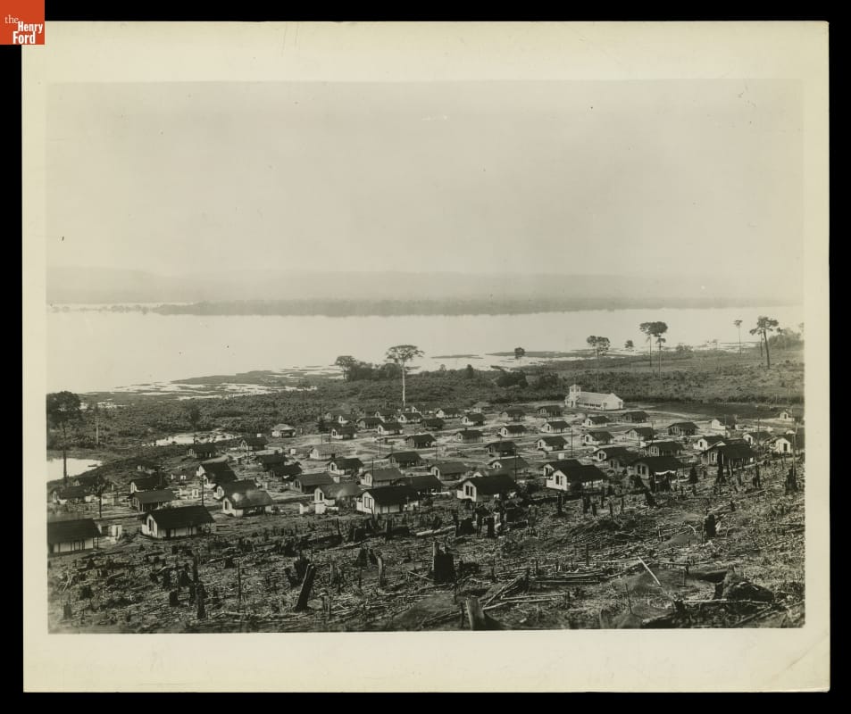 Henry Ford established Fordlandia and Belterra in the Brazilian rainforest to supply rubber for automobile production. He began shipping machinery and supplies to the Amazon in 1928. Ford paid the indigenous workers good wages and supplied various amenities -- he also imposed foreign work traditions and behavioral restrictions which the workers resented. The plantations failed and Ford Motor Company disposed of the project in 1945.