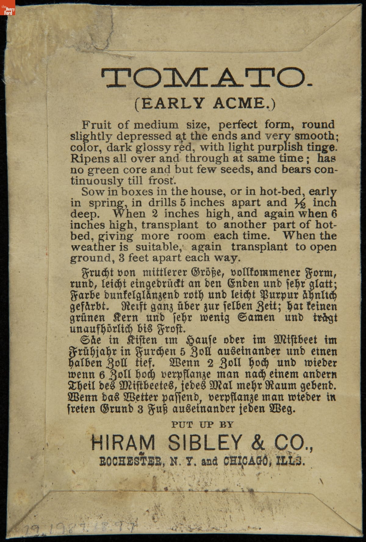 on front: TOMATO / EARLY ACME / SEND FOR OUR ILLUSTRATED CATALOGUE... / HIRAM SIBLEY & CO. / ROCHESTER, N.Y. & CHICAGO, ILL.