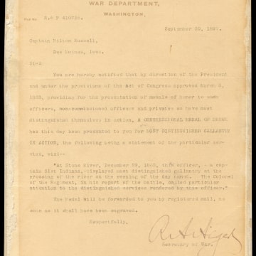 Congress awarded former Union Army Captain Milton Russell the Medal of Honor for his "distinguished gallantry in action" at the Battle of Stones River in Tennessee in December 1862. The Medal of Honor is the highest military award given by the United States government to a member of the armed services for valor in action against an enemy.