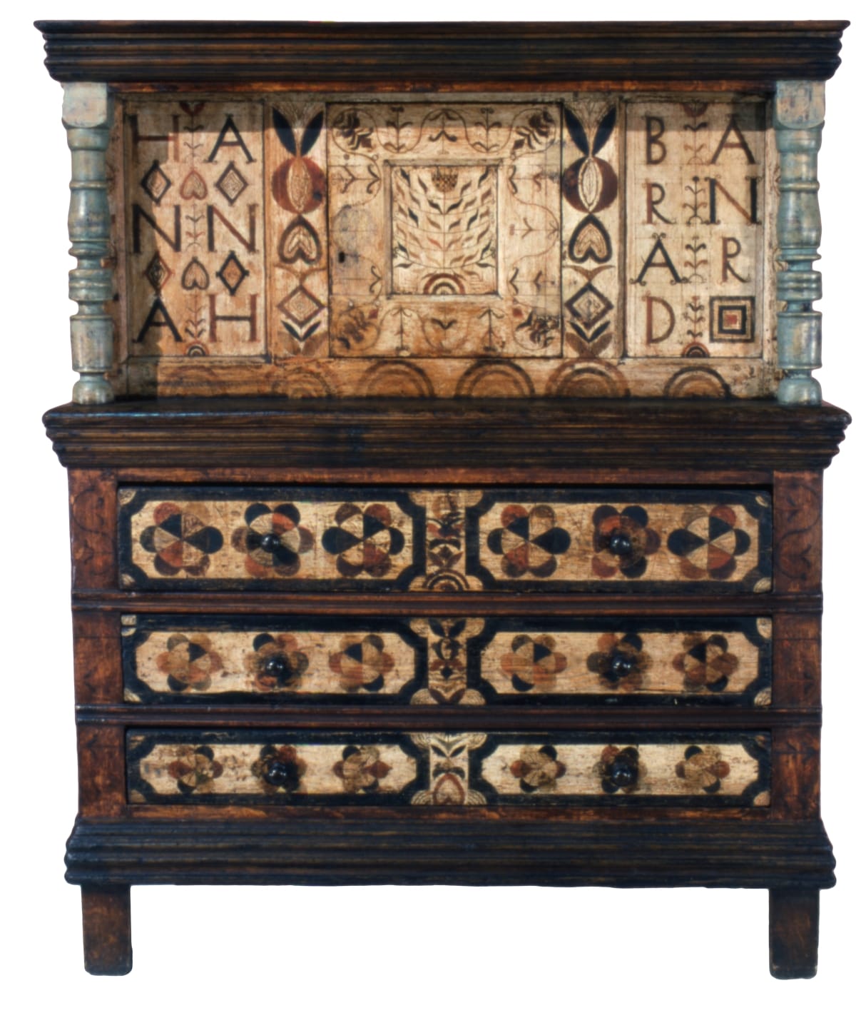 This court cupboard is remarkable because it was made for a woman and prominently features her name. It held newlywed Hannah Barnard's precious household belongings -- silver or pewter, ceramics, and linens. In addition to providing storage space, the gloriously decorated cupboard symbolized Hannah's wealth and status and served as a vibrant work of art in her Hadley, Massachusetts, home.