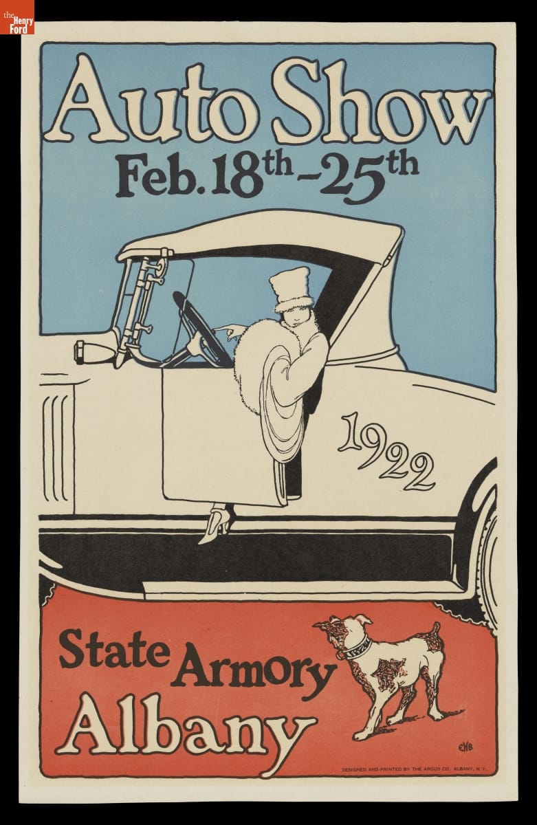 Auto shows use glamour, giveaways, spectacle, and sex appeal to show off manufacturers' latest offerings. Part entertainment and part consumer education, auto shows have their roots in 19th Century industrial exhibitions and world's fairs. New York City hosted America's first auto show in 1900 and the idea caught on. This poster promoted the 1922 Albany, New York, Auto Show.