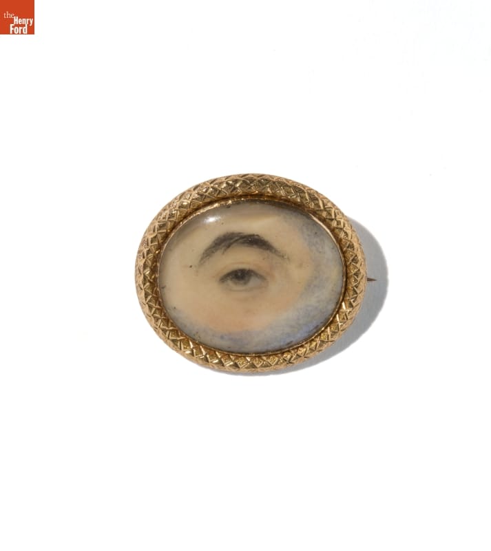 Originally created as intimate tokens of affection between lovers or families, the first of these was thought to have been commissioned in the 1780s by the English Prince Regent, later King George IV, for his lover, Mrs. Fitzherbert. They were popular in England and France and rare in America. After 1800, eye portraits became associated with mourning jewelry, falling out of fashion by the 1840s.
