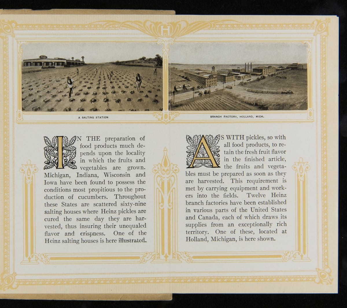 By the early 1900s, the H.J. Heinz Company had become well-known in the manufactured food industry. Its success resulted in the expansion of its production and distribution operations, which in turn created a need for larger executive quarters. This booklet provides an overview of the Administration Building at the Pittsburgh, Pennsylvania, factory, and describes the mural decorations which adorn its walls.