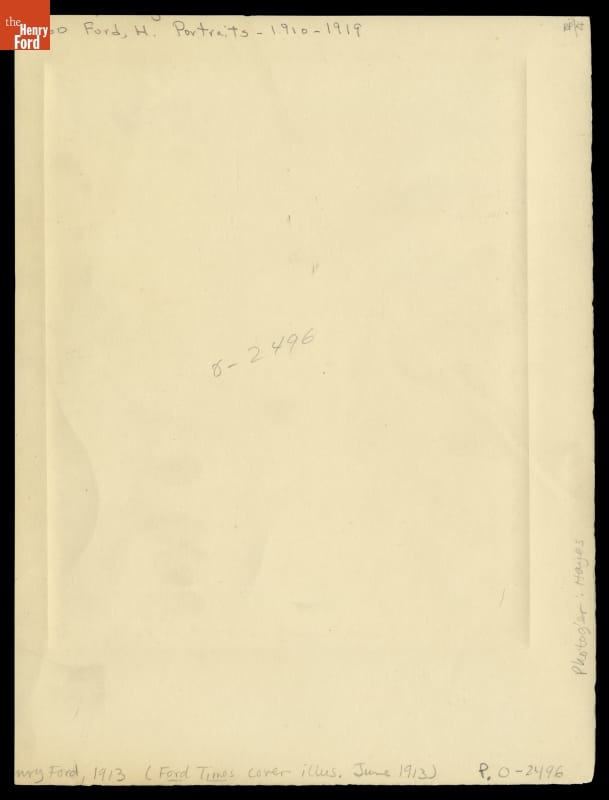 Henry Ford was near the peak of his manufacturing creativity when this portrait was made in 1913. The Model T, his car for the masses, was a tremendous sales success. The moving assembly line, which allowed Ford to build cars in unprecedented numbers, was being implemented. The Five Dollar Day, which revolutionized worker pay, was just on the horizon.
