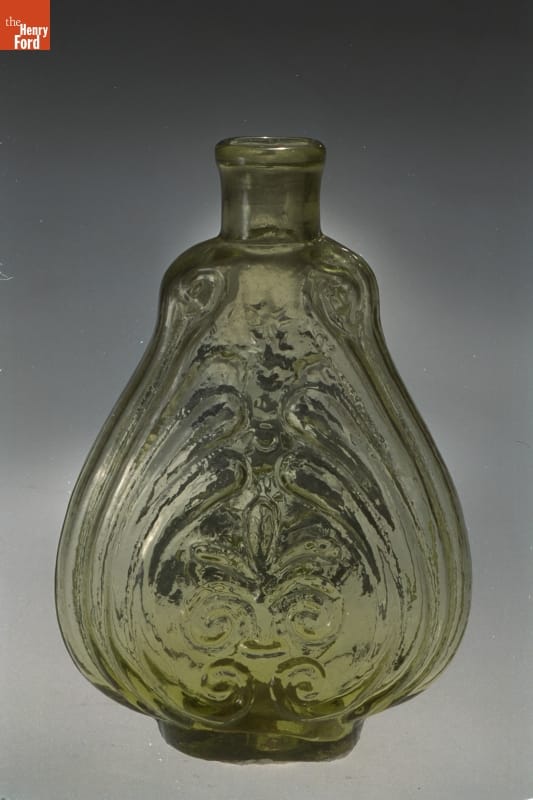 Glass factories in America began producing inexpensive, mold-formed flasks in the early 1800s. These figured flasks appealed to America's common man. Many of these flasks contained symbols of national pride or political or cultural affiliation. Embellishments on other flasks, like this one, were purely decorative.