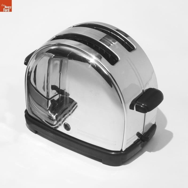 The Sunbeam T9 toaster's curved form and smooth surface reflect the Streamline Moderne aesthetic, an aspect of Art Deco design that emerged during the 1930s. Often called the "World's Fair Toaster," it was produced the same year as the 1939 New York World's Fair and has incised decoration reflecting the modernistic Trylon and Perisphere structures that formed the fair's futuristic "Theme Center."