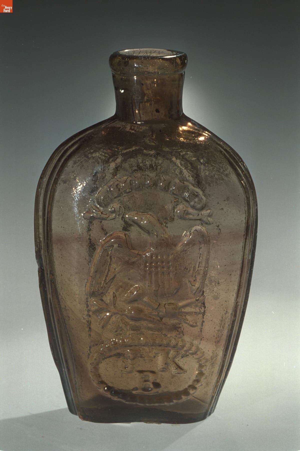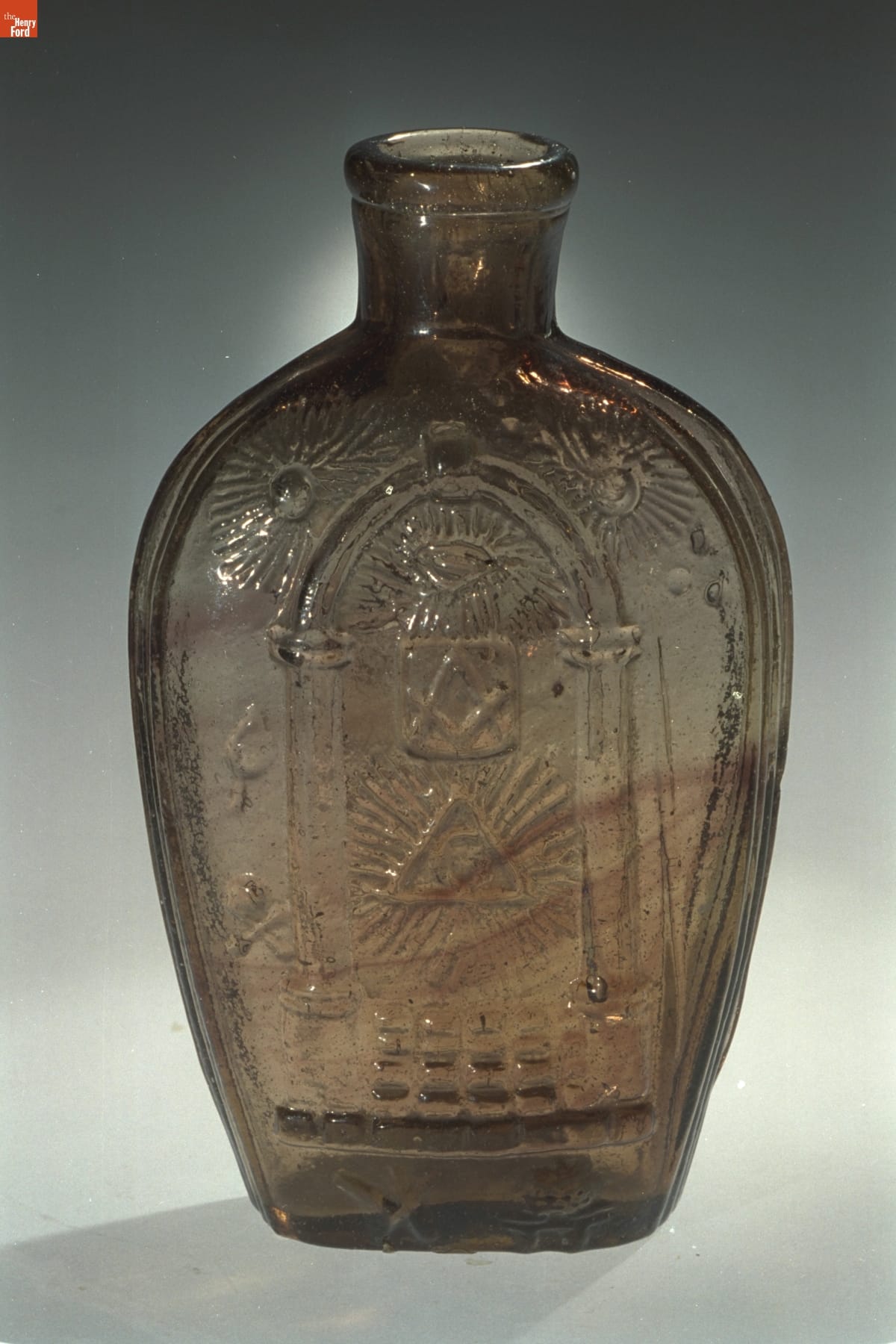 Glass factories in America began producing inexpensive, mold-formed flasks in the early 1800s. These figured flasks, often decorated with symbols of national pride or political or cultural affiliation, appealed to America's common man. Membership in the Freemasons grew in the early decades of the 1800s. Supporters of the Masonic order would recognize the ritualistic symbols on this and other similar flasks.