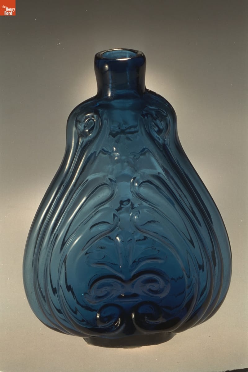 Glass factories in America began producing inexpensive, mold-formed flasks in the early 1800s. These figured flasks appealed to America's common man. Many of these flasks contained symbols of national pride or political or cultural affiliation. Embellishments on other flasks, like this one, were purely decorative.