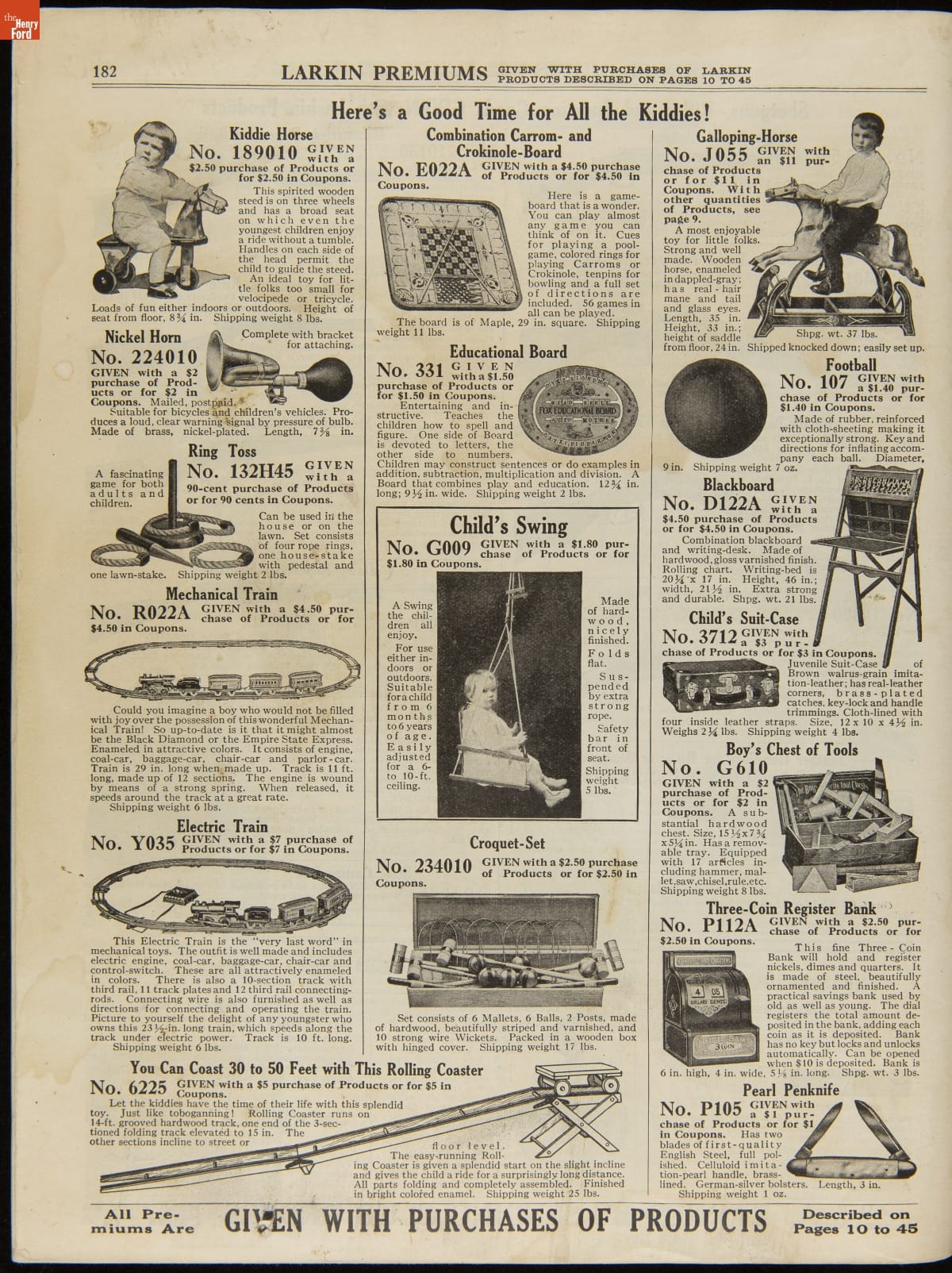 John D. Larkin established a soap manufacturing company in 1875. He hired his brother-in-law, Elbert Hubbard, as a salesman. Hubbard developed "The Larkin Idea," a plan that sold goods directly to consumers through mail-order catalogs and offered incentivizing giveaways. It was a success. By the early 1900s, Larkin's catalogs contained pages of products and even more pages of premiums from which customers could choose.