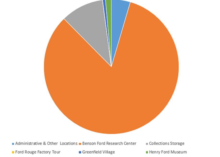 3. Eighty-three percent of the material we digitized in 2014 lives in the archival stacks of the Benson Ford Research Center. A little over 1% (or 178 objects) are on display in the Henry Ford Museum; less than 1% (89 objects) are on display in Greenfield Village. The remaining 15% (1,908 objects) are in storage or administrative locations—these are objects the public would not get to see, were it not for digitization. We also digitized four objects on display at the Ford Rouge Factory Tour (the cars)!