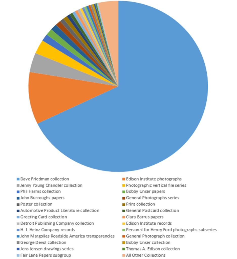 7. Most of the material we digitized in 2014 belongs to a collection, or subset (usually archival) of the overall holdings of The Henry Ford. By far the collection we digitized the most from this year is Dave Friedman (7,302 artifacts), but we also digitized significant amounts from Edison Institute photographs, Jenny Young Chandler collection, Photographic vertical file series, Phil Harms collection, Bobby Unser papers, John Burroughs papers, and the General Photographs series, as well as 82 other collections.