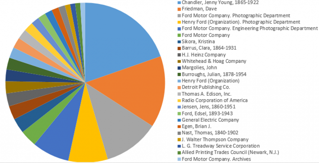 11. The objects we digitized in 2014 have over 1,600 known creators, the most common being various departments of Ford Motor Company (537), Jenny Young Chandler (393), Dave Friedman (330), and us, The Henry Ford (235). Three-quarters of the creators of artifacts digitized this year were only used on one object the entire year.