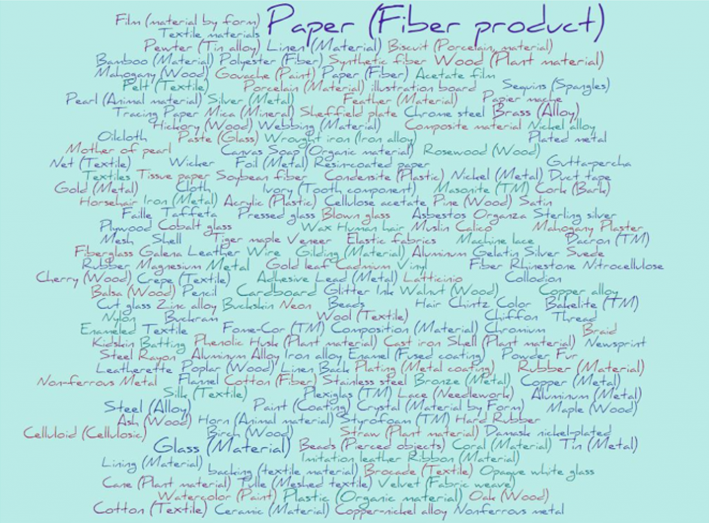 13. The most common materials for objects digitized in 2014 are paper, glass, wood, steel, metal, cardboard, linen, brass, plastic, and rubber. 143 materials only showed up once in objects digitized this year—these include amethyst, bloodstone, excelsior, hide, kraft paper, linoleum, mercury, onyx, polyvinyl chloride, and tinfoil (click the links to see the one object digitized this year of each material).