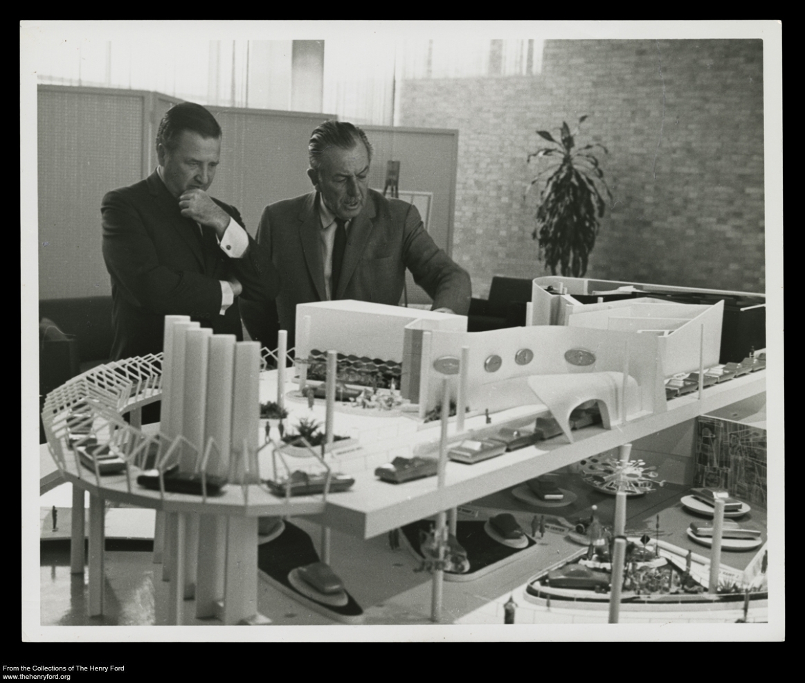 Using this detailed model, Walt Disney shows Ford Motor Company CEO and Chairman of the Board Henry Ford II some of the features that he and his Imagineers had dreamed up for the Ford pavilion. (THF114505)
