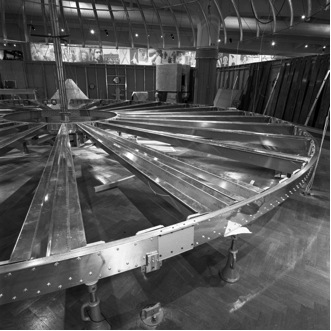A planned two-week checkup inspection of the iconic house of the future - Buckminster Fuller's Dymaxion House - turned into a two-month long “surgery” to repair extensive fatigue cracking of the thin aluminum beams that form the deck of the house. The cracks were visible from the underside, which is only accessible by sliding on your back on the museum's teak floor in about 18 inches of workspace.