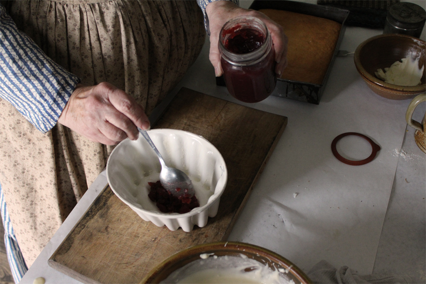 Adding grape jam to the Charlotte Russe mold inside of the Fords' kitchen in Greenfield Village.