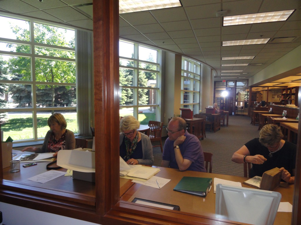 In the Benson Ford Research Center. Foreground, left to right: Fiona, Sue, Corey and Dawn. Angela is at the table in the back. (Photo by Donna Braden)