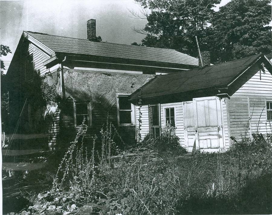 Looking into the kitchen from another angle, even more interesting features can be spotted. The wall with the doorway in the picture below shows a division in the kitchen, which in all likelihood was a pantry. So while it is unclear if the pantry wall in the picture is original to the house, there are several clues to help scholars determine a rough chronology. Many kitchens in the early Victorian era had no need for a pantry. After the Civil War, however, mass production and an increase in commercial products led to a need to store food and keep it organized. The Adams House as it stands today does indeed have a pantry, although not in the same location as the one depicted here. Like the other walls in the picture, the wall in question is made using plaster applied to strips of lath. This is the 19th-century equivalent of the beams and drywall system of today. All of the strips in the house are split laths rather than sawn laths, indicating that the interior wall is close to the rest of the house in terms of construction date. Laths that were sawn off of logs rather than stripped would illustrate a date closer to the 20th century and an increase in sawmill technology, when there was greater uniformity both in the form of houses and the materials that were used to make them. The pantry wall, with its construction indistinguishable from the rest of the original structure, could be original to the house or, if not built right away, a very quick addition afterwards.