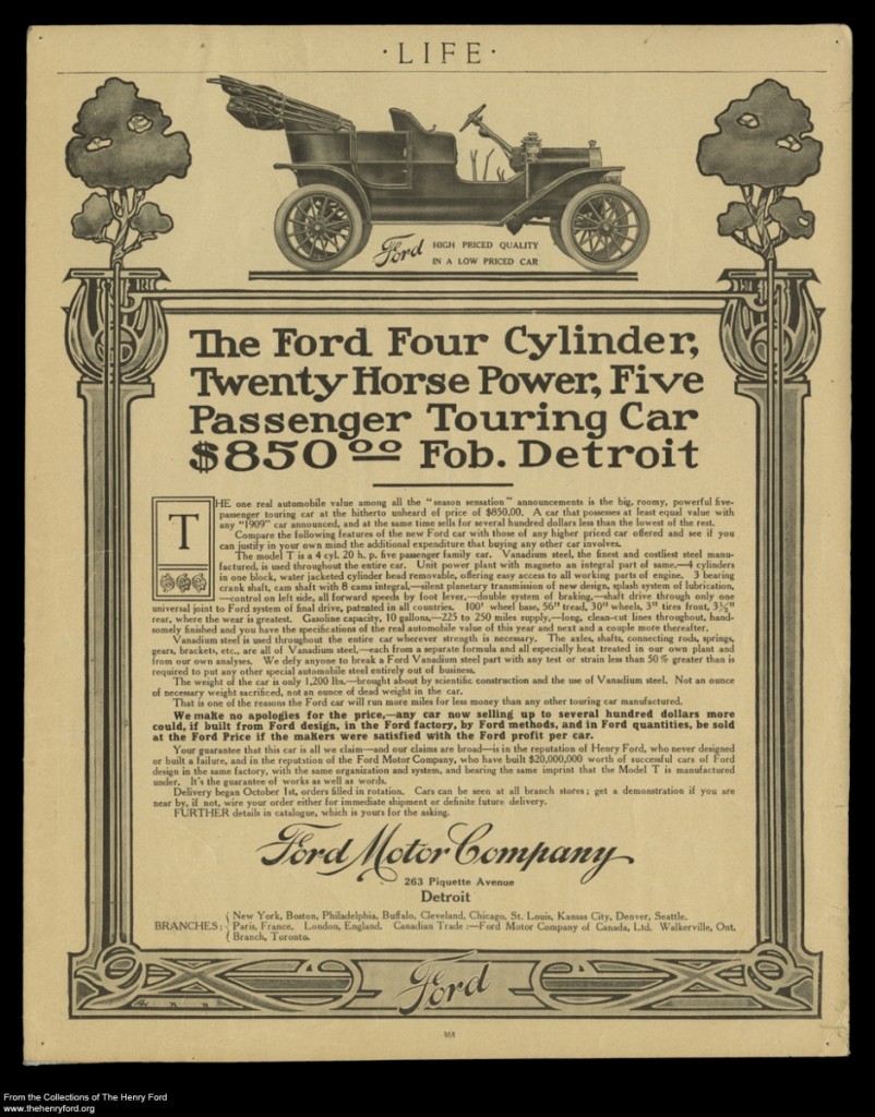 The very endurance of this single model offers an intriguing look at how the Model T was advertised over the nearly 20 years it was in production. Model T advertisements show the changes in print ads in general and the Ford Company's marketing policies in particular. These advertisements also reflect the company's response to changing market conditions.