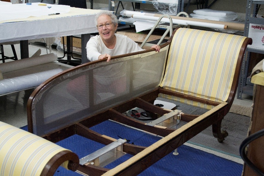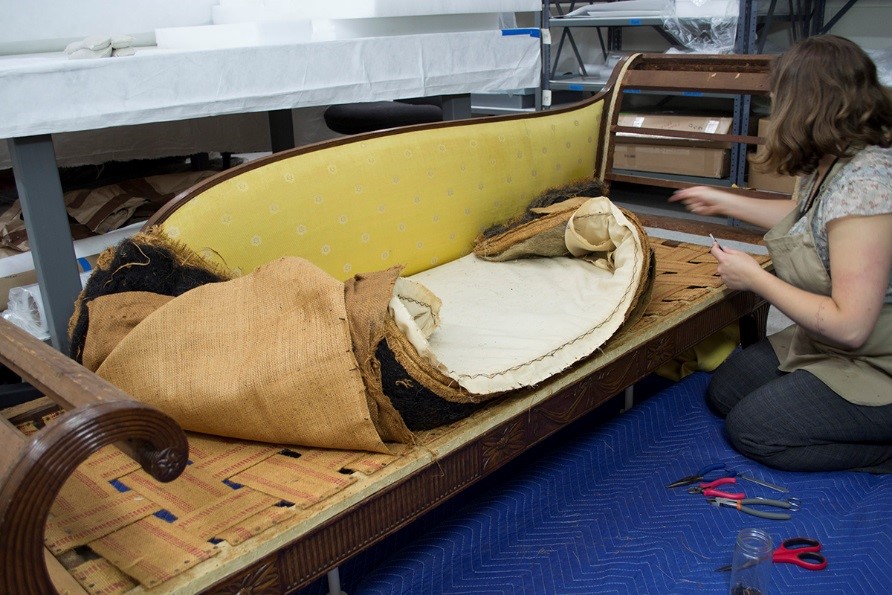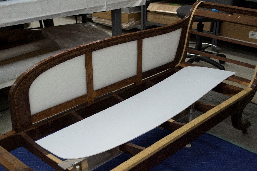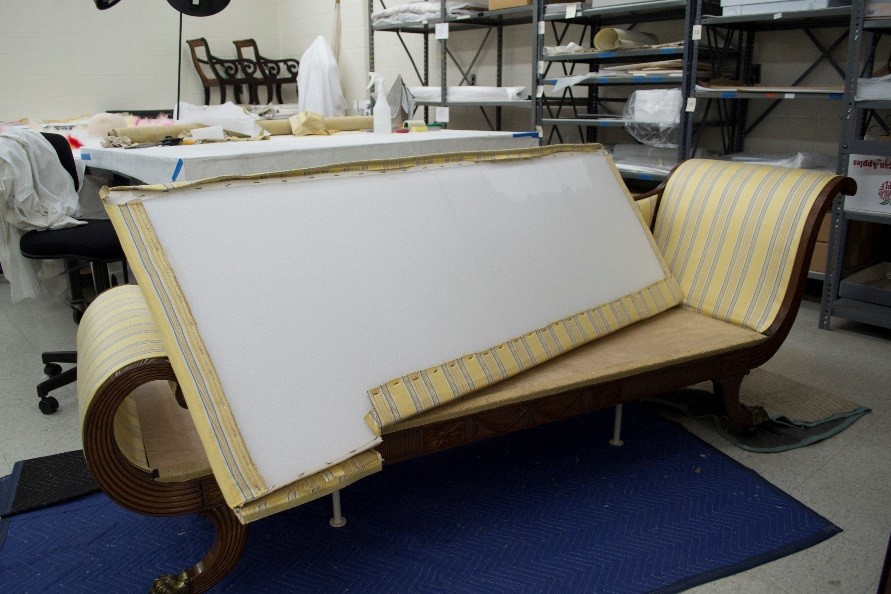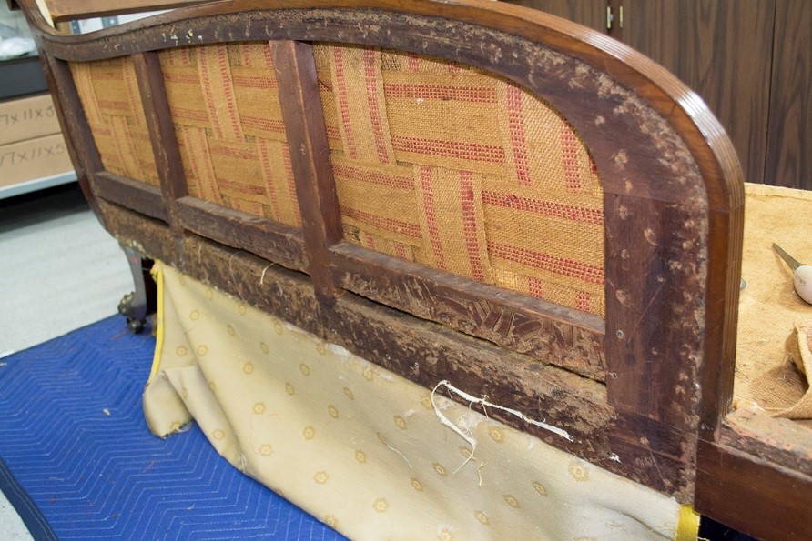It is amazing that such a specialized piece survived intact into the early 20th century, when it was acquired by The Henry Ford. This is perhaps due to the flamboyant design of the back and foot rests, which makes it an exceptionally elegant, almost sculptural, piece of furniture. The couch was last reupholstered in 1954 by Ernest LoNano, a well-known furniture restorer of the time. Since then, the upholstery had become quite dirty and worn.