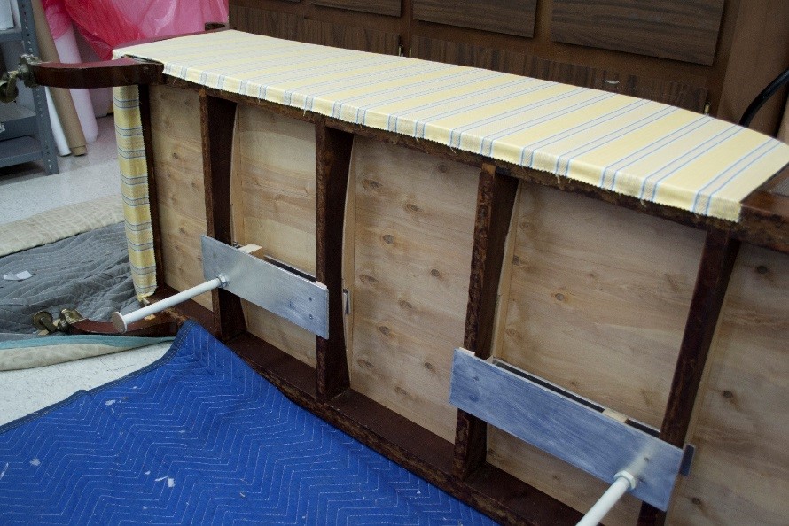 After a long search, a historically-appropriate replacement fabric was selected for the show cover. We began removing the layers of upholstery materials and padding.