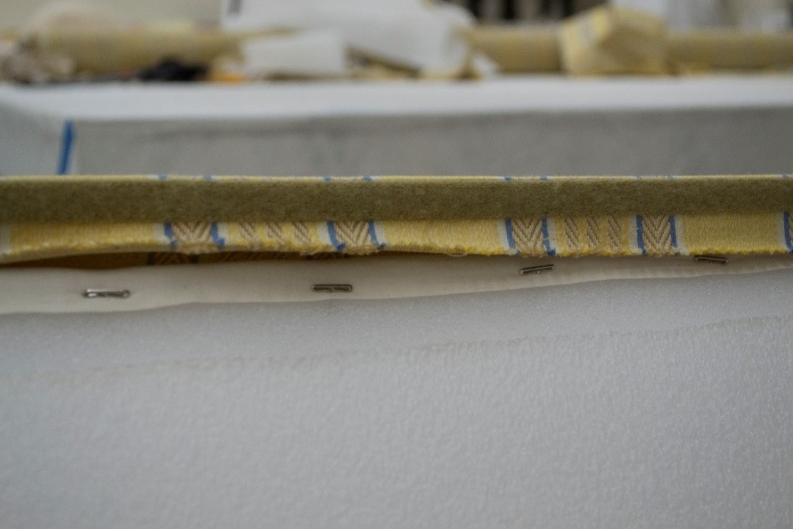 Next, twill tape was attached to the frame using a reversible adhesive. The twill tape would later act as a base for the Velcro used to attach the fabric covering, thus protecting the wood from further damage.