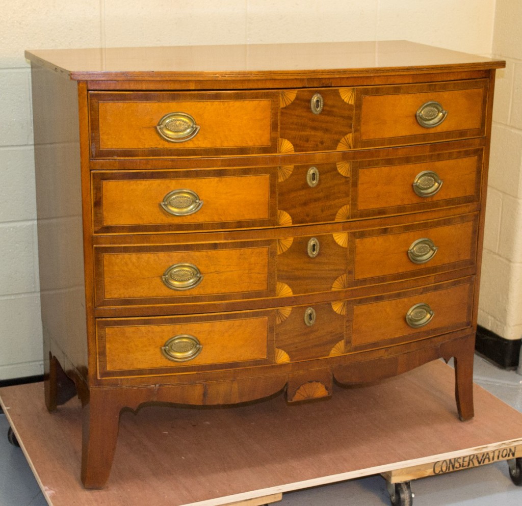 The conservation of this chest of drawers started with a detailed examination to identify every area of damage to both the finish and the structure of the artifact. Each area of damaged veneer was labeled using a small piece of removable tape and the item was photographed.